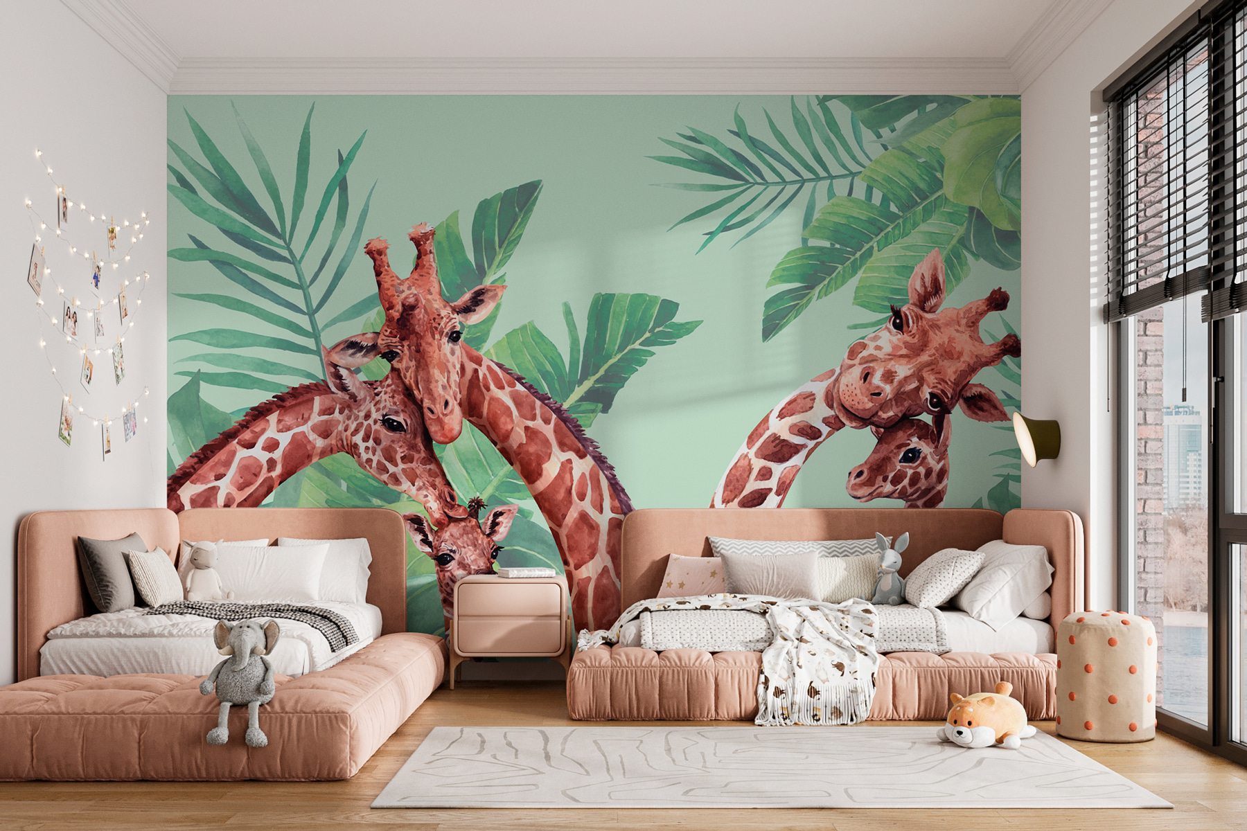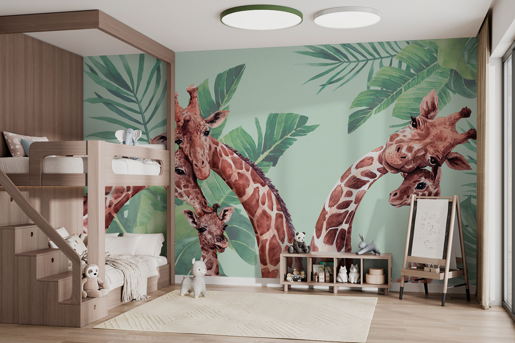 Stellen Sie sich vor, Sie betreten einen Raum und werden von einer fröhlichen Gruppe von Giraffen vor einem üppigen, grünen Hintergrund begrüßt. Mit dieser Fototapete holen Sie sich ein fröhliches Stück Safari direkt in Ihr Zuhause. Perfekt für Kinderzimmer, Kinderzimmer oder einfach für jeden Raum, der einen lustigen, von der Natur inspirierten Touch braucht. Jede Giraffe mit ihrem liebenswerten, sanften Gesichtsausdruck scheint zu sagen: “Hallo, mein Freund!” Es ist fast so, als würden diese schlaksigen Gesellen aus dem Dschungel herausschauen und ein Gefühl von Abenteuer und Laune vermitteln. Wenn Sie jemanden kennen, der Tiere liebt oder ein bisschen Wildnis in seine Einrichtung bringen möchte, ist dieses Wandbild eine fantastische Wahl. Und wer würde nicht jedes Mal lächeln, wenn er diese sanften Giganten sieht? Ob die Kinder sich nun vorstellen, unter den Bäumen zu spielen, oder ob die beruhigenden Grüntöne einen langen Tag vergessen lassen, dieses Wandbild ist mehr als nur eine Tapete – es ist eine Stimmung.