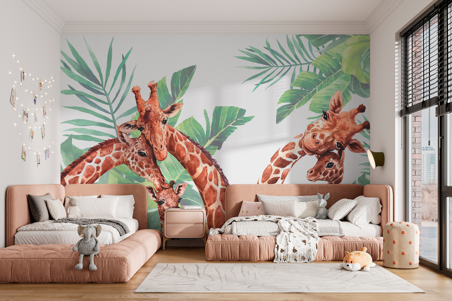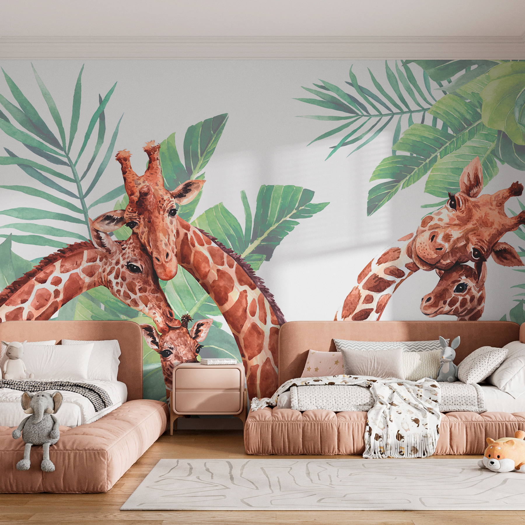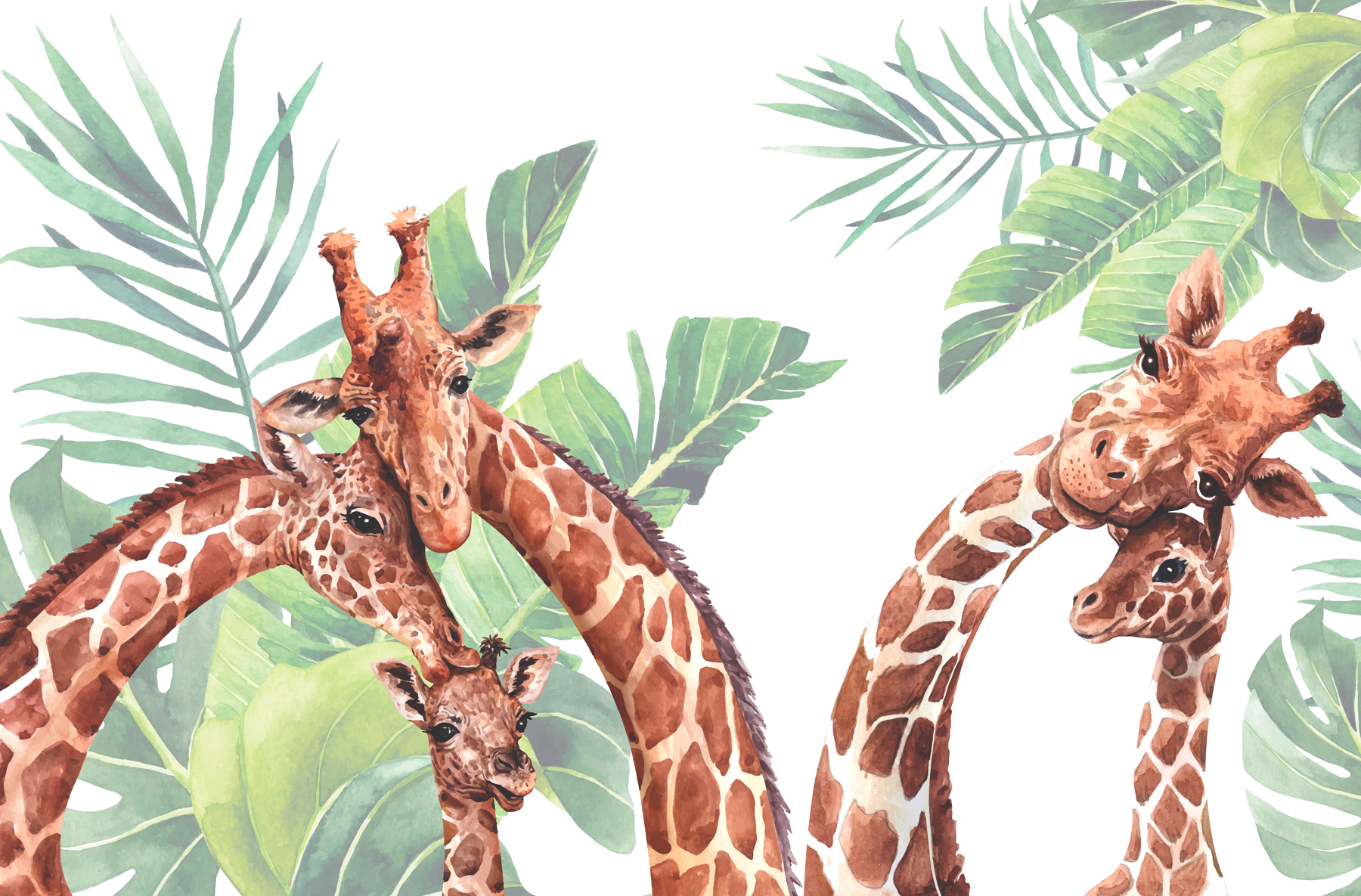 Stellen Sie sich vor, Sie wachen auf und werden von einer bezaubernden Giraffenfamilie gegrüßt, die Ihnen einen süßen Morgengruß bereitet! Die “Fototapeten Group of Giraffes with Leaves” ist wie ein fröhliches Safari-Abenteuer direkt an Ihrer Wand. Diese Giraffen mit ihren sanften Augen und ihrem neugierigen Gesichtsausdruck eignen sich perfekt für Kinderzimmer oder andere verspielte Räume und verleihen allem einen Hauch von Magie. Und die üppigen grünen Blätter sorgen für eine frische, beruhigende Atmosphäre. Es ist fast so, als könne man das Rascheln der Blätter und das leise Flüstern der Giraffen hören. Ideal, um die Fantasie anzuregen und einen skurrilen, von der Natur inspirierten Rückzugsort zu Hause zu schaffen. Ob für das Kinderzimmer Ihres Kindes oder als Überraschung für den Tierliebhaber in Ihrem Leben, dieses Wandbild bringt Wärme und Wunder in jeden Raum.