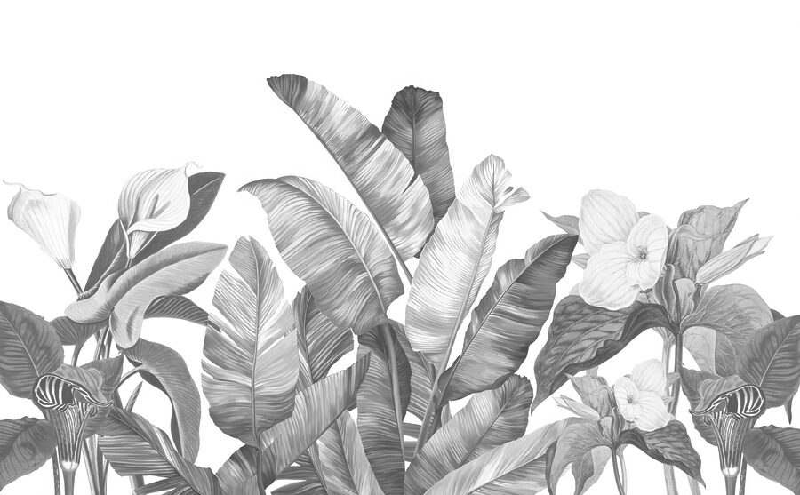 Sind Sie bereit für einen Mini-Urlaub, der nur einen Blick entfernt ist? Tauchen Sie mit dieser Fototapete in Ihren persönlichen monochromen Dschungel ein; sie ist stilvoll, beruhigend und mühelos cool.
