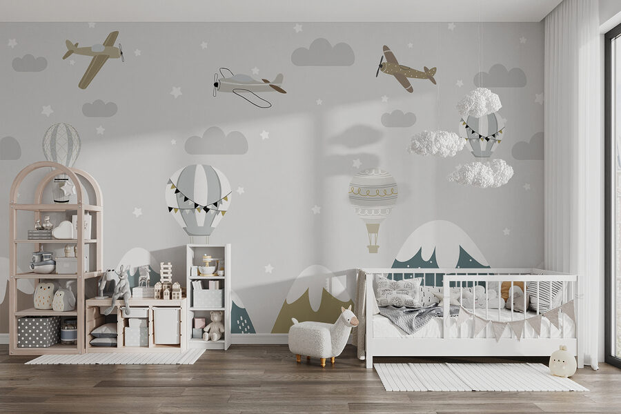 Perfekt für ein Kinderzimmer oder ein Spielzimmer, verleiht es einen Hauch von Abenteuer und viel Charme. Die kleinen Flugzeuge scheinen bereit zu sein, Ihr Kind auf eine Reise durch die Lüfte mitzunehmen, während die Heißluftballons sanft vorbeischweben und ein Gefühl der Gelassenheit vermitteln. Dieses Wandbild schmückt nicht nur – es erzählt eine Geschichte.