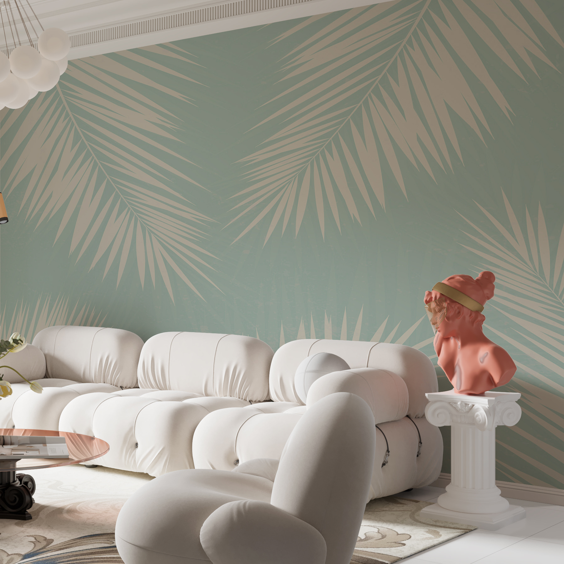 Stellen Sie sich vor, Sie könnten sich die ruhige Atmosphäre eines tropischen Urlaubs in Ihr Wohnzimmer holen – genau das können Sie mit dieser Wandtapete Tropical Palm Leaves. Perfekt für alle, die sich nach dem üppigen Grün und der entspannten Atmosphäre sehnen, aber ohne die tatsächliche Feuchtigkeit. Die sanften Grüntöne und die detaillierten Blätter sorgen dafür, dass Sie sich wie im Dschungel fühlen, nur ohne die Moskitos.