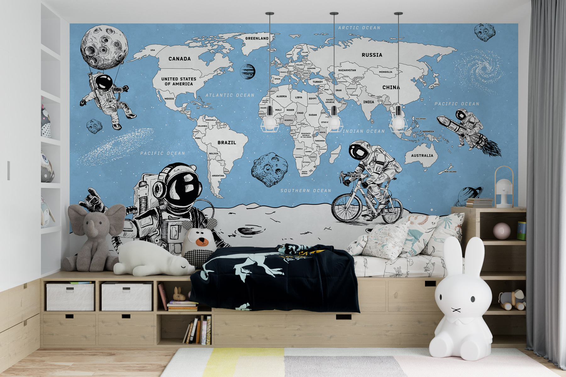 Stellen Sie sich vor, dass diese Fototapete Ihr Zimmer erhellt – es ist, als würden Sie in eine ganz neue Welt eintreten! Diese Zeichnung zeigt einen Astronauten, der direkt auf dem Mond in die Pedale tritt, während die Erde im Hintergrund sanft dahinschwebt. Es ist schrullig, lebendig und ein bisschen magisch. Perfekt für Kinder, oder für jeden, der im Herzen noch ein Kind ist.