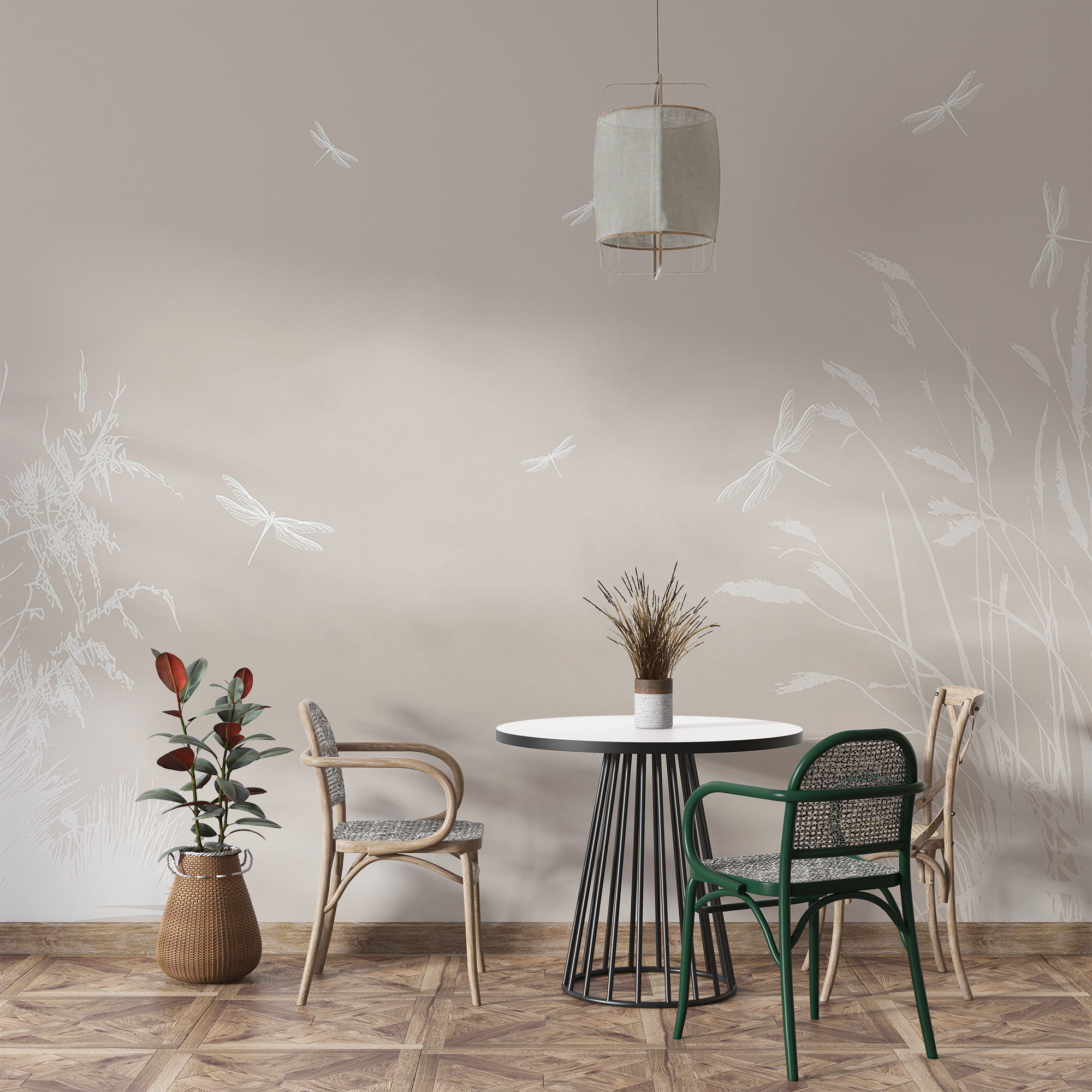 Sie brauchen etwas Verträumtes für Ihre Wand? Sehen Sie sich diese Fototapete an, auf der zarte weiße Libellen auf einem weichen, erdigen Hintergrund herumflattern. Es ist wie ein sanfter Nachmittag auf einem Feld, an dem die Libellen in einer leichten Brise tanzen. Stellen Sie sich vor, Sie sitzen in Ihrem Lieblingssessel, mit einer Tasse Tee in der Hand, ganz entspannt. Es hat diese beruhigende Ausstrahlung, bei der man einfach tief durchatmen und sich entspannen möchte. Perfekt, um einen Hauch von Natur und Ruhe in Ihren Raum zu bringen! Glauben Sie mir, Sie werden sich jedes Mal, wenn Sie vorbeigehen, darin verlieren wollen.