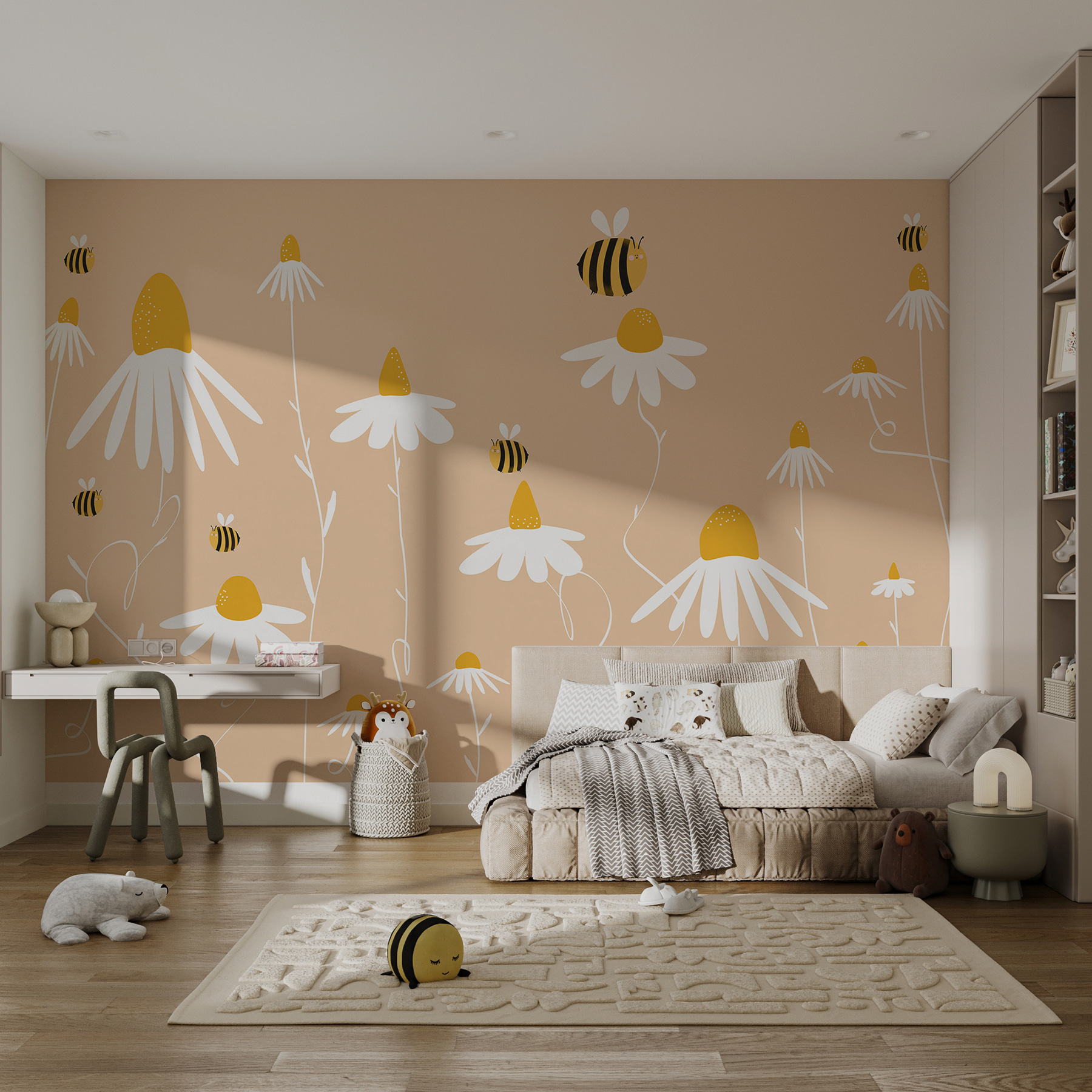 Aber nicht nur für Kinder, sondern auch für das Arbeitszimmer oder eine Leseecke! Es ist, als hätte man ein Stückchen Garten im Haus, nur ohne die Gießereiarbeit. Die sanften Farben und das schlichte Design beruhigen das Gemüt und geben dem Ganzen einen Hauch von Helligkeit. Selbst an den grauesten Tagen sorgt diese Fototapete für eine leichte und fröhliche Stimmung.