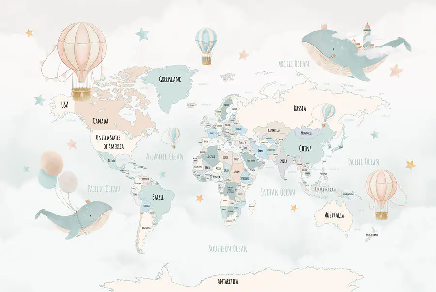 Haben Sie jemals davon geträumt, in einem Heißluftballon um die Welt zu fliegen? Mit dieser niedlichen Fototapete können Sie sich in die Lüfte schwingen, ohne Ihren gemütlichen Platz zu verlassen. Mit ihren skurrilen blauen und weißen Heißluftballons, verspielten Walen und pastellfarbenen Sternen, die über einer sanften Weltkarte schweben, ist sie perfekt geeignet, um die Neugierde zu wecken und einen spielerischen Geist in jeden Raum zu bringen. Stellen Sie sich ein Kinderzimmer vor, in dem sich Gutenachtgeschichten in globale Abenteuer verwandeln, oder ein Kinderzimmer, das mit seiner sanften, verträumten Farbpalette beruhigt. Es ist nicht nur ein Wandbild, es ist eine Einladung zum Entdecken. Kulisse für Ihre nächste fantastische Geschichte? Erledigt.