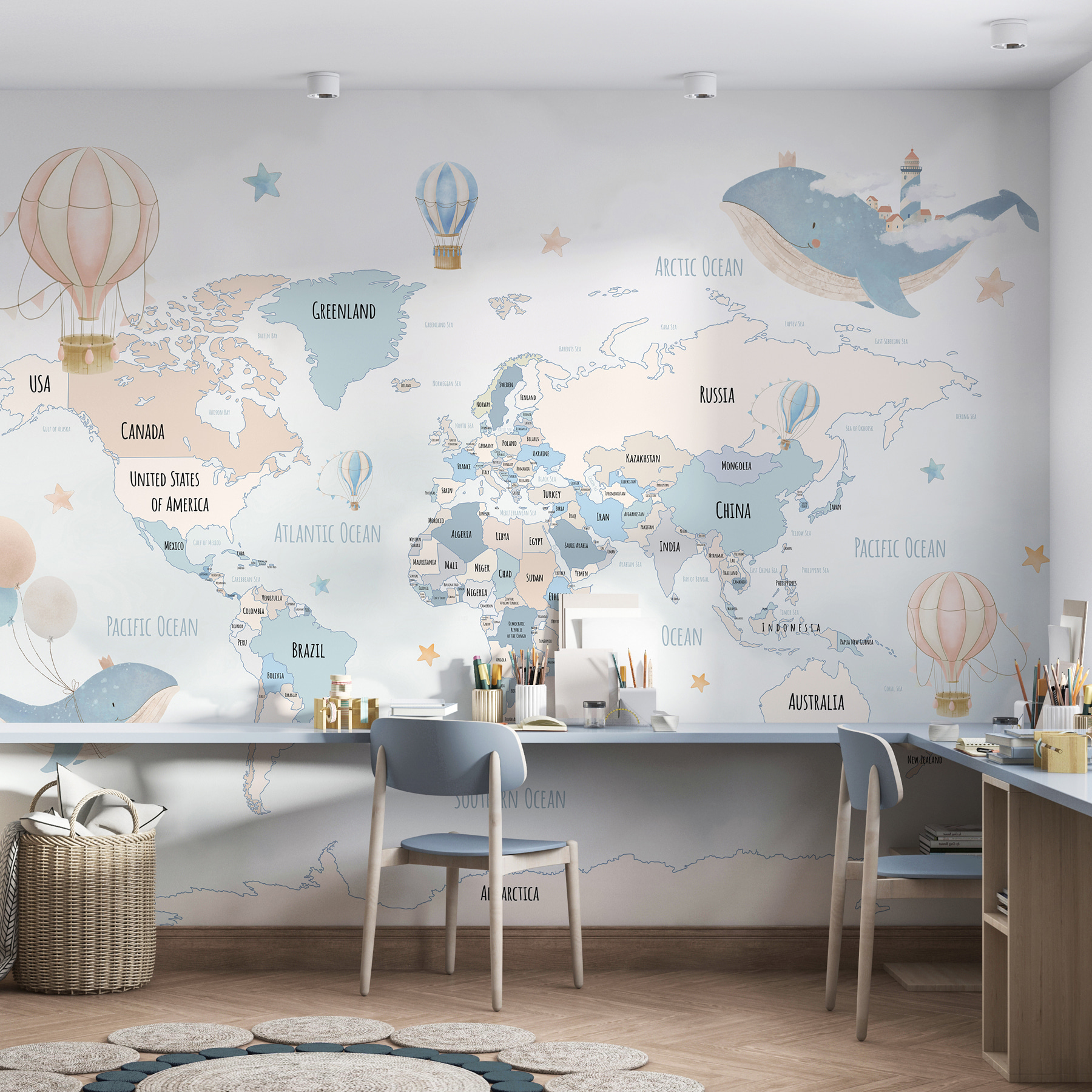 Stellen Sie sich vor, Sie könnten das Zimmer Ihres Kindes mit diesem atemberaubenden “Fototapeten Blue and White Hot Air Balloon” verschönern. Mit seinen charmanten Heißluftballons, Landkartendetails und niedlichen Tieren ist es perfekt, um die Fantasie der Kleinen zu beflügeln. Stellen Sie sich vor, wie das weiche Nachmittagslicht sanfte Schatten wirft und die Gute-Nacht-Geschichten zu globalen Abenteuern werden lässt. Jedes Detail verspricht, eine Wand in einen Reisepass für Träume zu verwandeln – Kinder können auf Brasilien oder Australien zeigen und ihrer Neugier freien Lauf lassen. Es ist nicht nur ein Wandbild, sondern eine tägliche Einladung zum Staunen, Entdecken und Träumen. Und diese sanften Pastelltöne? Sie fügen sich nahtlos in jede Einrichtung ein und sorgen für eine heitere und doch verspielte Atmosphäre. Perfekt, um Kinderzimmern und Spielzimmern einen magischen Touch zu verleihen.