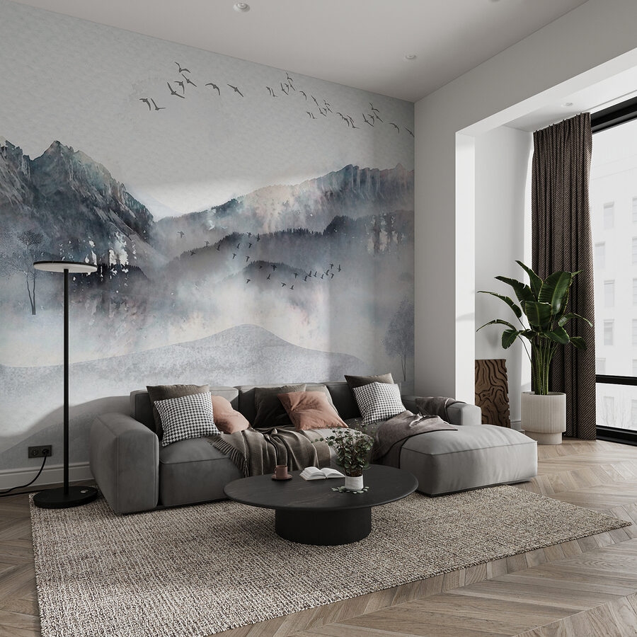 Stellen Sie sich vor, Sie betreten einen Raum und werden von einer Gruppe von Vögeln begrüßt, die über einem verträumten Himmel schweben und hoch über einer nebligen Waldlandschaft schweben. Dieses Aquarell ist nicht nur Kunst – es ist ein Erlebnis. Der beruhigende Nebel, die sanften Hügel und die fernen Berge sind wie ein sanftes Flüstern der Natur. Es ist fast so, als könne man das Flüstern der Bäume hören und die kühle, frische Morgenluft auf der Haut spüren.