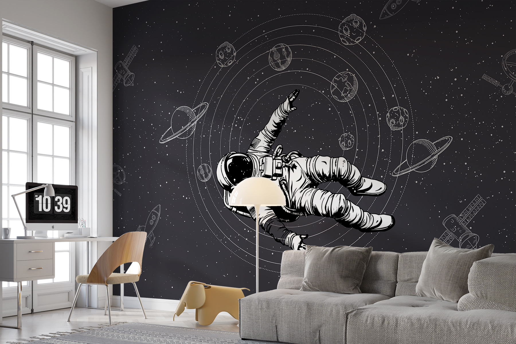 Haben Sie schon einmal davon geträumt, zwischen den Sternen zu schweben? Das ist die Fototapete “Astronaut Floating in Space”! Diese kosmische Schönheit gehört in jeden Raum, in dem der Fantasie freien Lauf gelassen wird, wie z. B. in ein Kinderzimmer oder in Ihr schrulliges Büro zu Hause. Stellen Sie sich vor: Sie schlürfen einen Kaffee und haben das Gefühl, im Weltall zu schweben. Das schlichte schwarz-weiße Design verbindet Raffinesse mit einem Hauch von Laune. Es ist, als hätte das Universum Ihre Wand umarmt. Es verleiht jedem Raum Tiefe und Abenteuer und macht jeden Blick zu einer kleinen Weltraum-Odyssee. Hängen Sie es auf, und lassen Sie Ihre Gedanken um die Möglichkeiten kreisen!