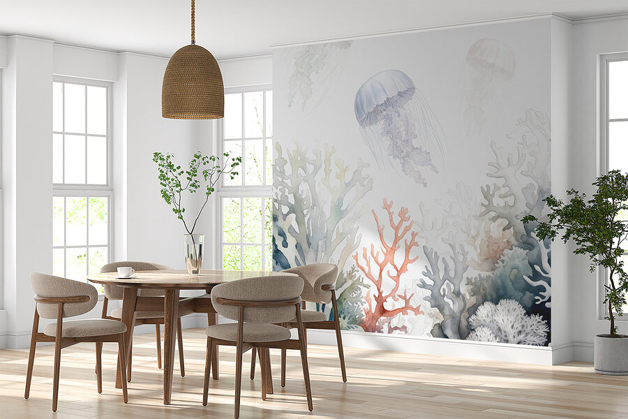 Stellen Sie sich vor, Sie schwimmen durch ein friedliches Unterwasserwunderland. Das ist die Art von Atmosphäre, die dieses Wandbild “Quallen, die über bunte Korallen treiben” in Ihren Raum bringt. Es ist wie ein Flüstern des Ozeans an Ihren Wänden! Die sanften Aquarelltöne sorgen für ein entspanntes Gefühl – fast so, als ob Sie das sanfte Wiegen des Meeres hören könnten. Perfekt für alle, die den Charme des Meeres lieben, denn es ist ein echter Gesprächsanlass. Machen Sie es sich in dieser ruhigen Szene bequem und lassen Sie Ihre Sorgen mit diesen wunderschönen Quallen verschwinden. Ein Hauch von Farbe und Ruhe in Ihrem Zuhause!