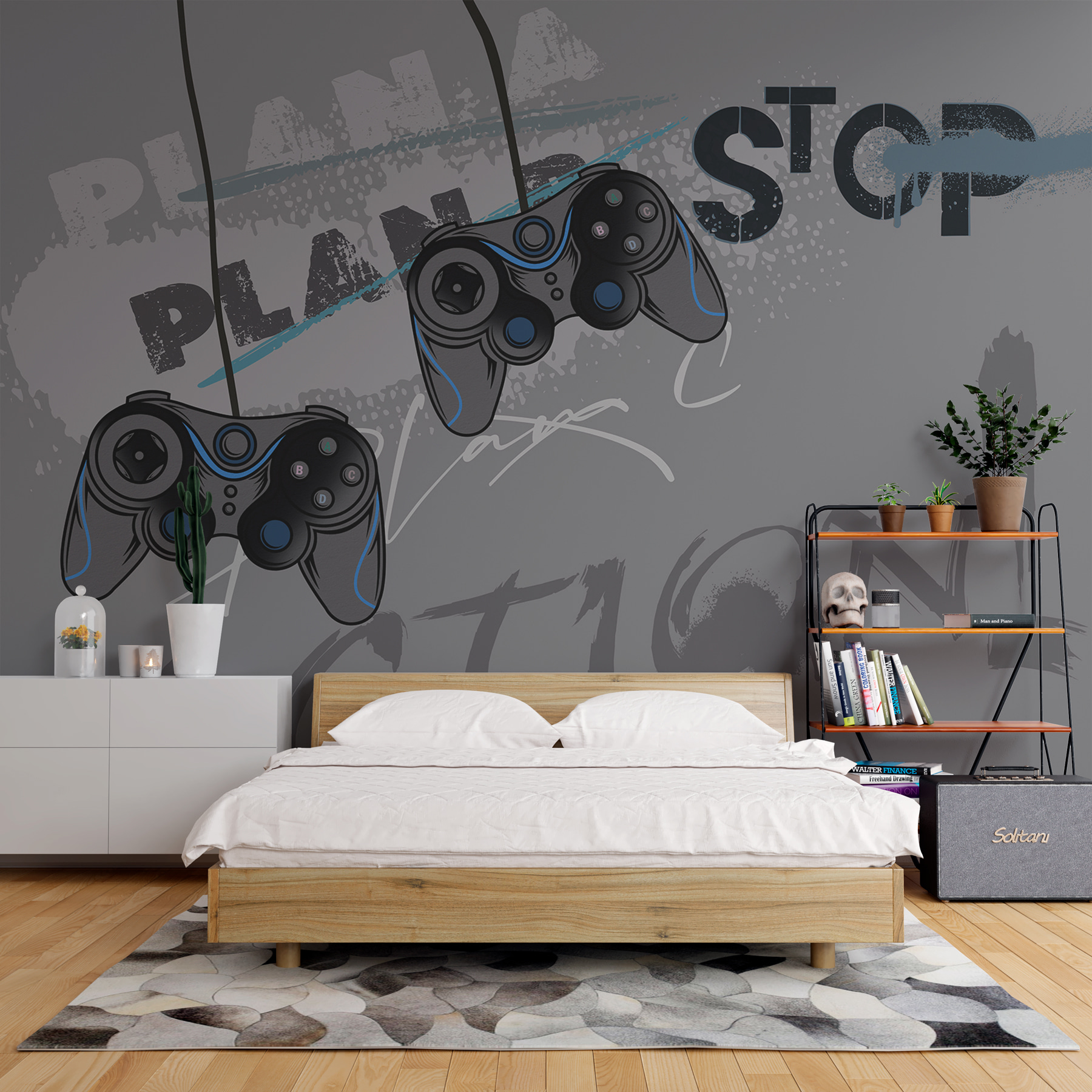 Verwandeln Sie jeden Raum in ein lebendiges Spieleparadies mit dieser Fototapete, die Videospiel-Controller vor einem schlichten grauen Hintergrund zeigt. Es ist nicht nur ein Design, sondern eine Aufforderung zum Handeln für all die nächtlichen Spielesessions und epischen Siege. Stellen Sie sich vor: ein gemütlicher Raum, in dem Freunde zusammenkommen, Snacks in Reichweite, Lachen in der Luft und Augen, die auf den Bildschirm gerichtet sind – dieses Wandbild gibt den perfekten Ton an. Die verspielten PLAN” und STOP”-Grafiken sorgen für Spaß und Energie und erinnern jeden daran, dass jeder Moment zählt, sowohl im Spiel als auch außerhalb. Das Wandbild ist ideal für ein Spielzimmer, das Schlafzimmer eines jungen Spielers oder sogar für einen lustigen Wohnbereich. Also, warum nicht den Gamer-Geist annehmen?