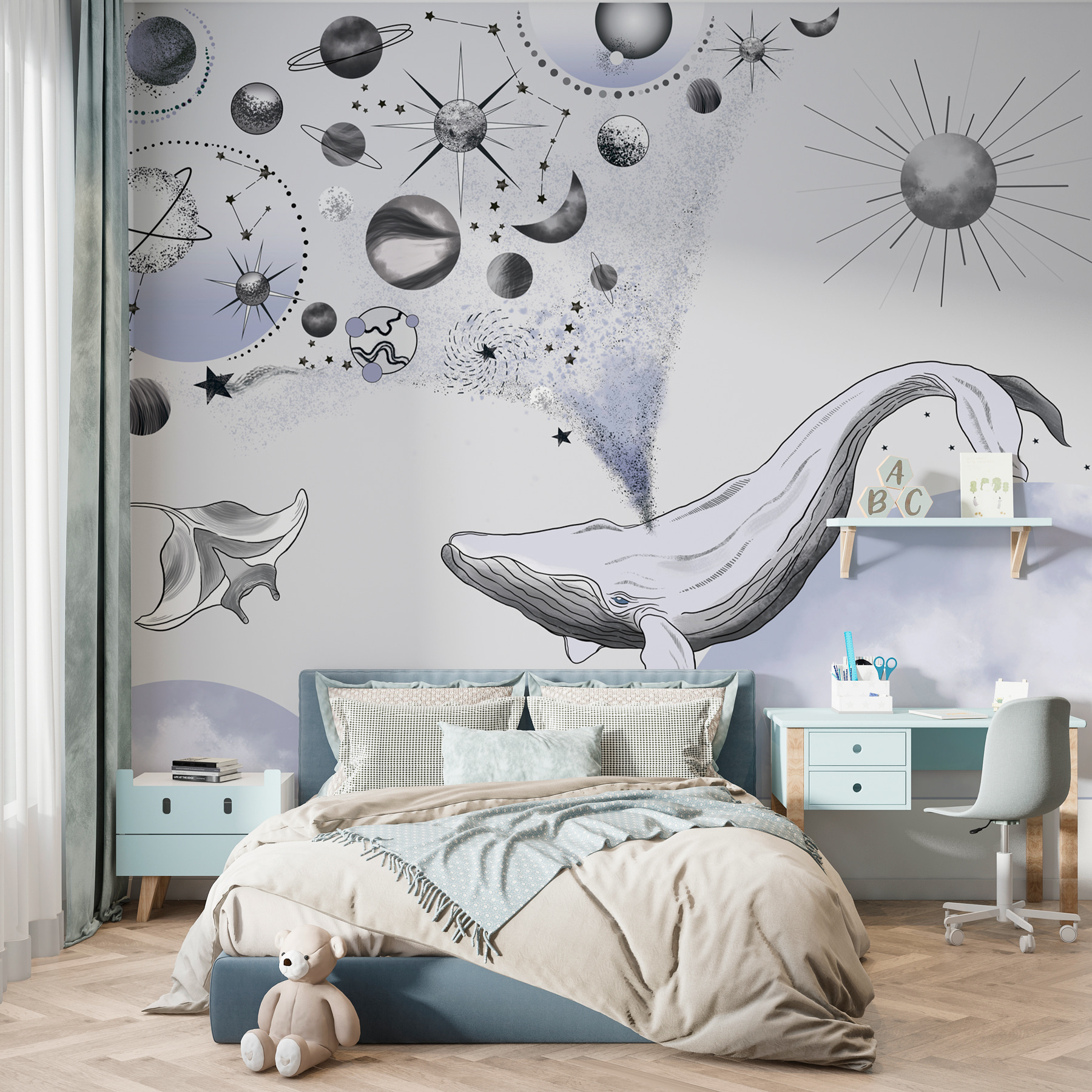 Verwandeln Sie jeden Raum mit dieser Fototapete, die wie ein Spaziergang durch ein verträumtes Wunderland wirkt. Stellen Sie sich einen sanften Wal vor, der durch den Kosmos gleitet, umgeben von einem Wirbel aus Sternenzauber und verspielten Planeten. Die Schwarz-Weiß-Optik verleiht ihm einen modernen Touch, der vom Kinderzimmer bis zur gemütlichen Leseecke passt. Es sorgt für Gesprächsstoff und weckt Tagträume von den Tiefen des Ozeans und dem Sternenhimmel. Stellen Sie sich vor, Sie machen es sich mit einem guten Buch gemütlich, blicken auf dieses Wandbild und spüren den Funken der Fantasie. Perfekt für alle, die einen Hauch von Laune in ihrer Einrichtung lieben!