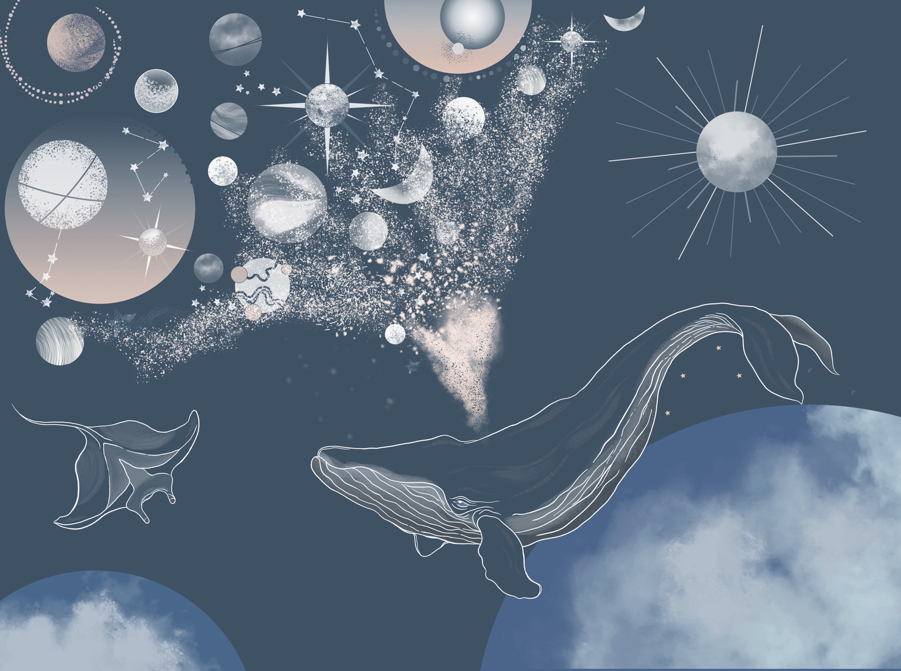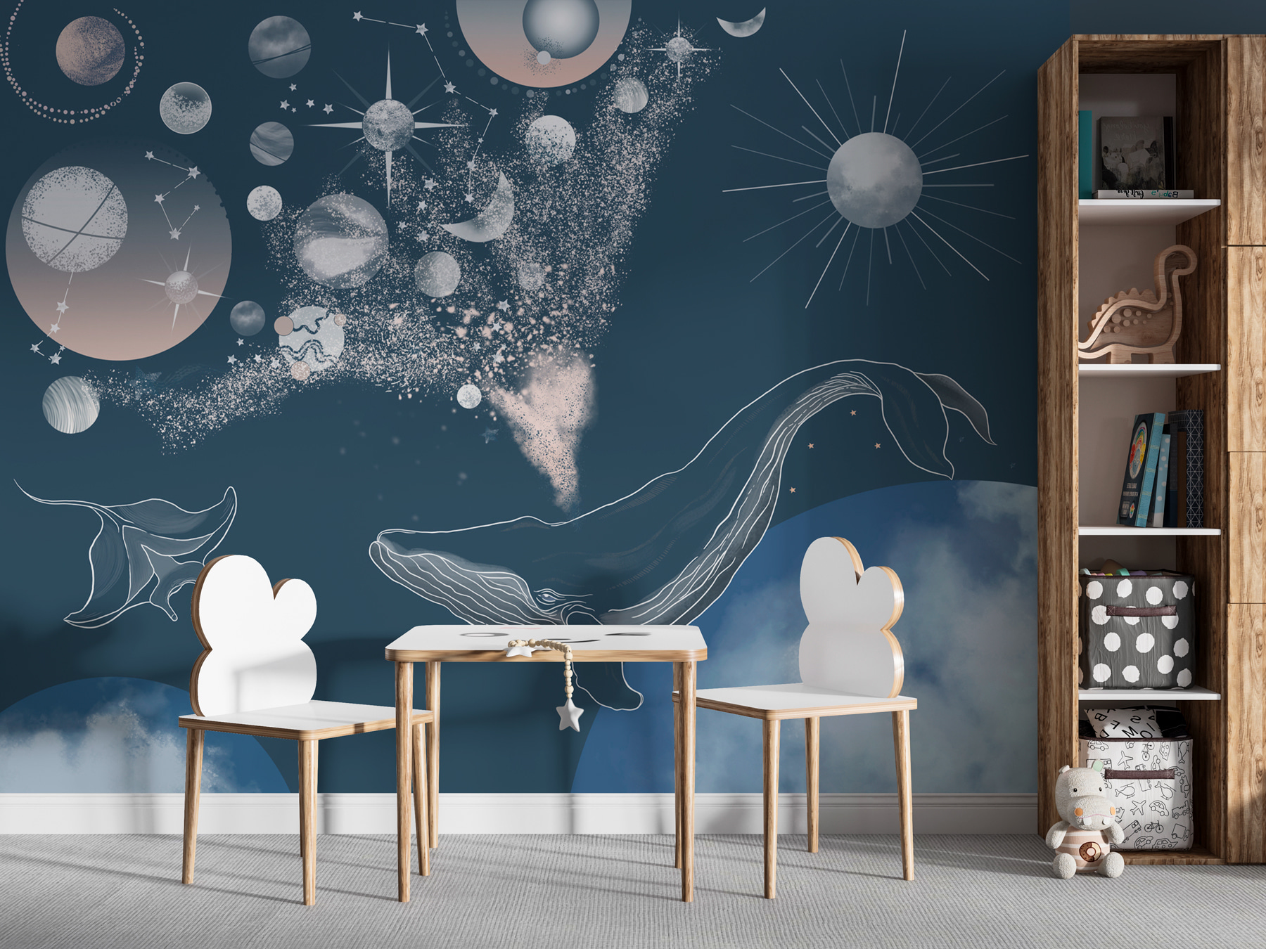 “Fototapeten Moon and the Moon” ist eines dieser Werke, die Sie direkt in einen Traum versetzen. Stellen Sie sich vor, Ihr Zimmer wird zu einem Ort, an dem Sie die Sterne unter Wasser beobachten können. Ja, das ist richtig. Diese Fototapete zeigt einen majestätischen Wal, der durch eine kosmische Szene mit Planeten, Sternen und Mondphasen kreuzt – als ob der Ozean auf das Universum trifft! Perfekt, um einen Hauch von Magie in jeden Raum zu bringen. Die Gäste könnten sich darin verlieren, die Konstellationen zu verfolgen und sich die Geschichte hinter jedem Himmelsobjekt vorzustellen. Es ist ein Gesprächsanreger, ein Blickfang und ein gemütlicher Rückzugsort in einem. Tauchen Sie ein und lassen Sie Ihre Wände eine skurrile Geschichte erzählen!