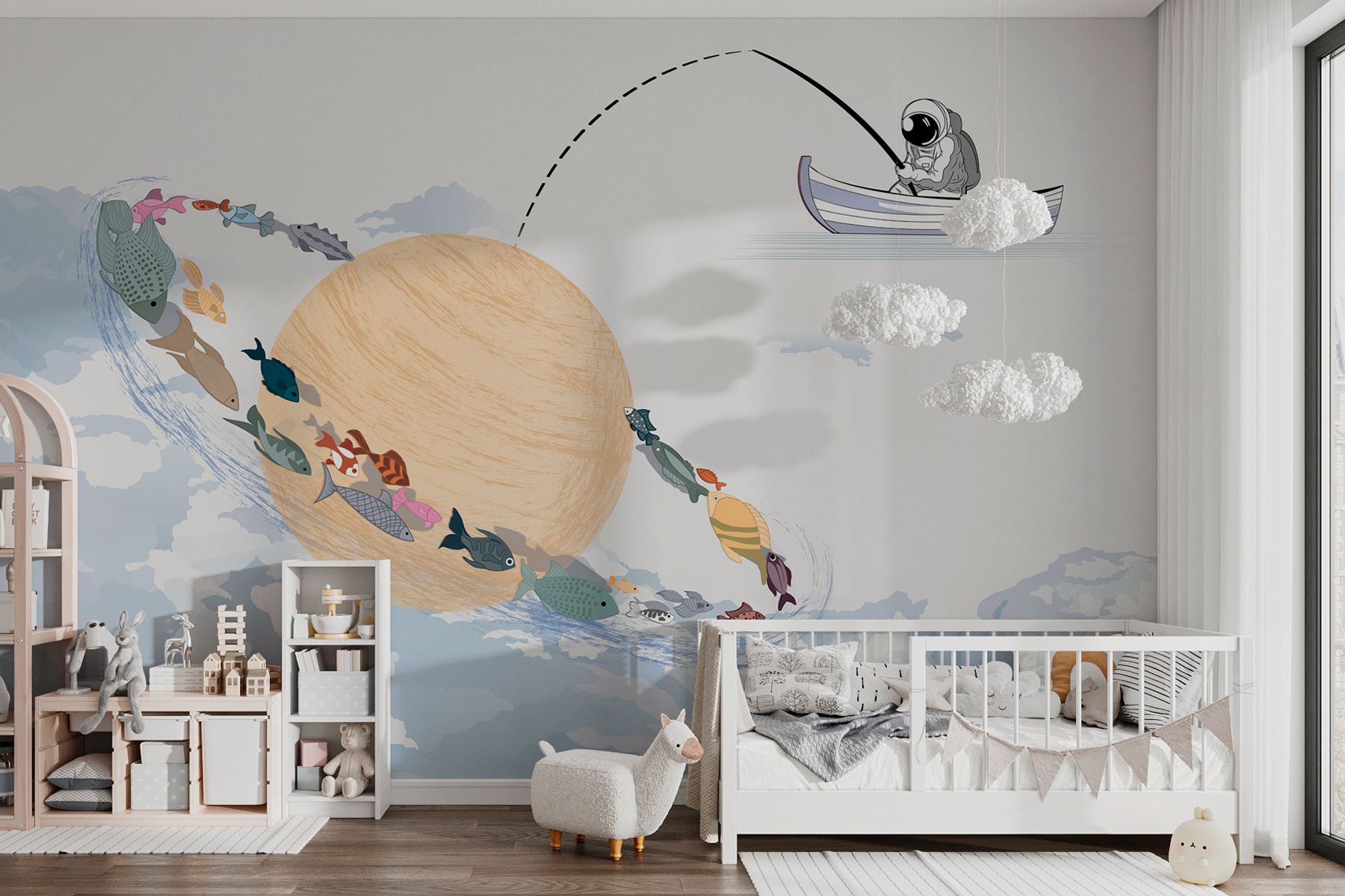 Tauchen Sie mit diesem skurrilen Wandbild in eine Welt ein, in der der Himmel auf das Meer trifft. Stellen Sie sich einen riesigen Planeten vor, der zwischen flauschigen Wolken schwebt, während verspielte Fische um ihn herumschwimmen, als ob sie sich auf einem kosmischen Abenteuer befinden. Der Astronaut, der angelt, ist das Highlight – wer hätte gedacht, dass er einen solchen Fang machen würde? Diese Fototapete bringt einen Hauch von Fantasie in jedes Zimmer und lässt es wie eine gemütliche Flucht aus dem Alltag erscheinen. Ob im Kinderzimmer oder in einem skurrilen Wohnbereich, es wird Freude und Gespräche auslösen. Stellen Sie sich nur vor, wie viele Lächeln Sie damit zaubern werden!