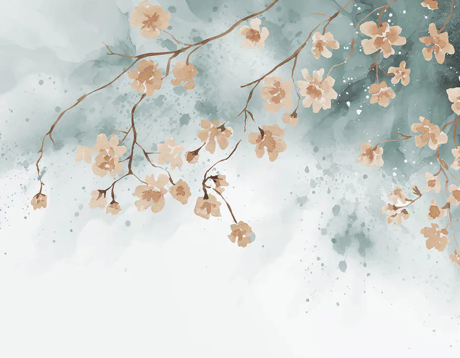 Diese Fototapete würde eine gemütliche Ecke oder eine Leseecke völlig verwandeln. Man möchte am liebsten einen Tee trinken, sich entspannen und die zarten Zweige und Blüten bestaunen. Die Mischung aus blaugrünen Tönen und hellen, pfirsichfarbenen Blumen hat etwas sehr Beruhigendes an sich. Jedes Mal, wenn Sie vorbeigehen, ist es wie eine kleine Flucht.