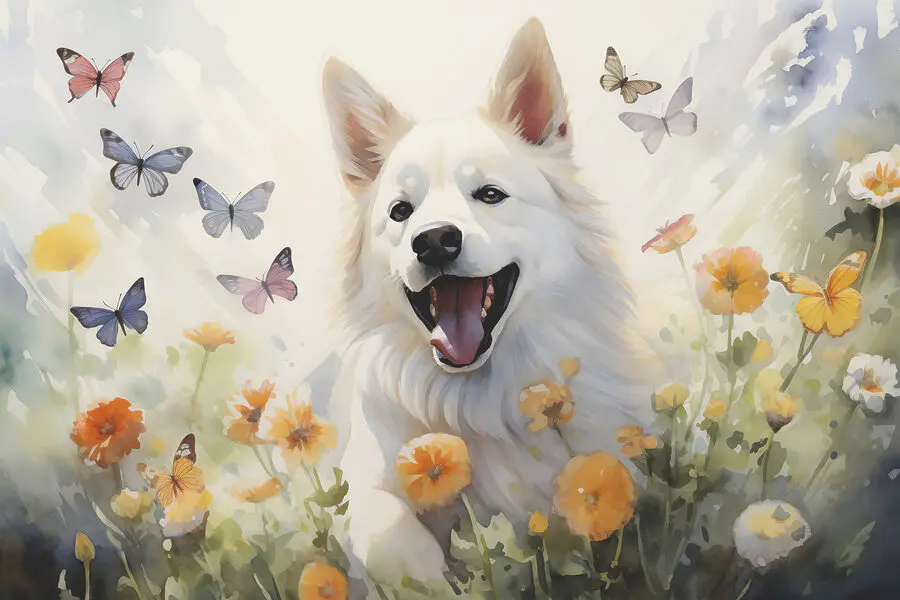 Fototapeten Weißer Hund mit Schmetterlingen um ihn herum (Artikelnummer: w00941)