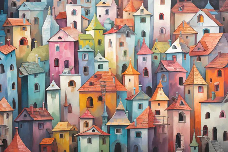 Verwandeln Sie jede Wand in eine lebendige Straßenszene mit diesem Wandbild aus bunten Gebäuden. Stellen Sie sich vor, Sie betreten ein skurriles Dorf, in dem jedes Gebäude seine eigene Geschichte erzählt und die leuchtenden Farbtöne im Licht tanzen. Stellen Sie sich ein Wochenendtreffen mit Freunden vor, deren Lachen widerhallt, während sie den verspielten Charme dieses Kunstwerks bewundern. Es ist, als ob Sie einen Ausbruch von Freude direkt in Ihr Wohnzimmer – oder Ihre Küche oder wo auch immer Sie wollen – bringen würden! Es ist perfekt, um einen langweiligen Raum aufzulockern und verleiht ihm einen Hauch von Magie, der alle zum Lächeln bringt. Wer würde sich nicht von einem Spritzer Farbe inspiriert fühlen?