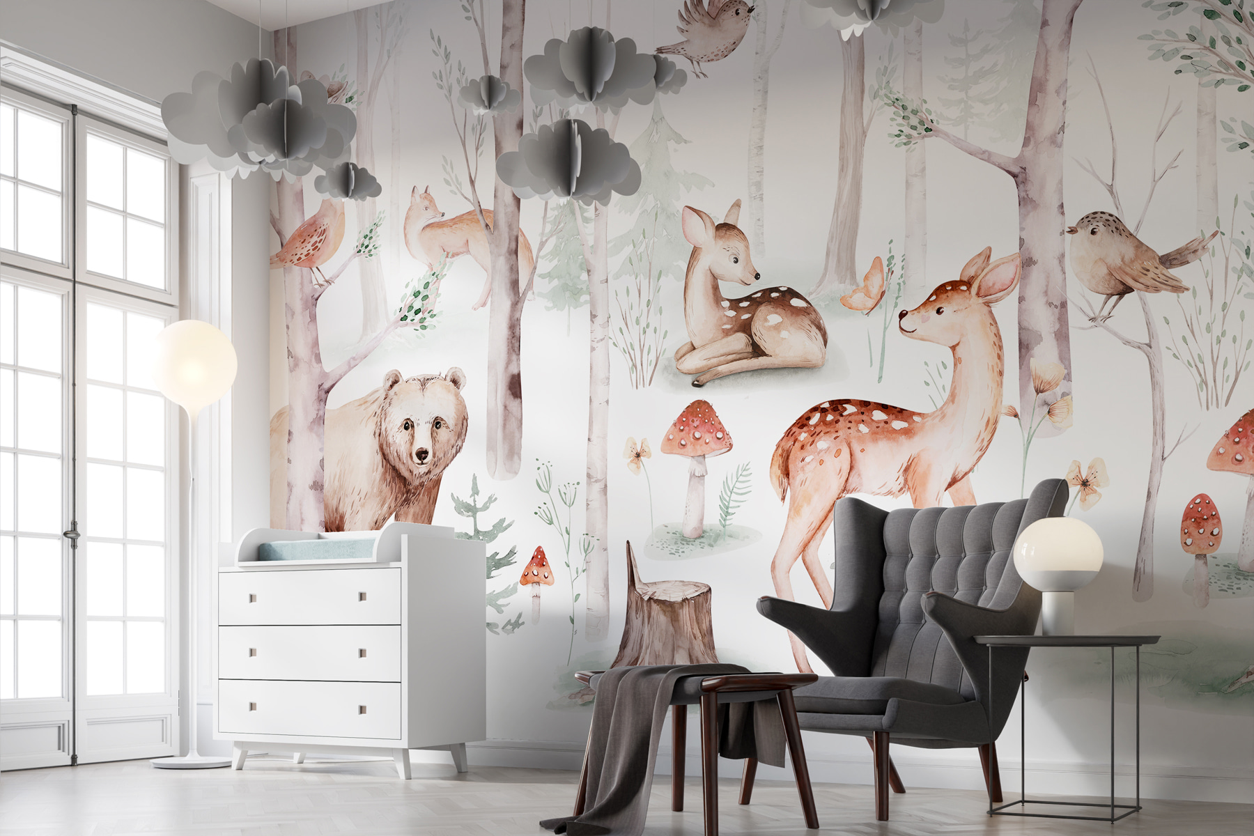 Tauchen Sie mit dieser bezaubernden Fototapete in ein skurriles Waldgebiet ein. Stellen Sie sich vor, Sie hätten eine gemütliche Waldecke in Ihren eigenen vier Wänden – mit freundlichen Rehen, neugierigen Füchsen und leise singenden Vögeln. Es ist wie eine sanfte Märchenbuchszene an Ihrer Wand! Perfekt für Naturliebhaber oder für alle, die sich einfach mal zurückziehen wollen. Stellen Sie sich vor, wie Sie mit einem Buch in der Hand an einem Tee nippen, während diese heitere Umgebung Sie zum Entspannen einlädt. Wer hätte gedacht, dass Wandkunst so… friedlich sein kann? Verwandeln Sie Ihr Zimmer in einen beruhigenden Rückzugsort, an dem der Wald immer in voller Blüte steht.