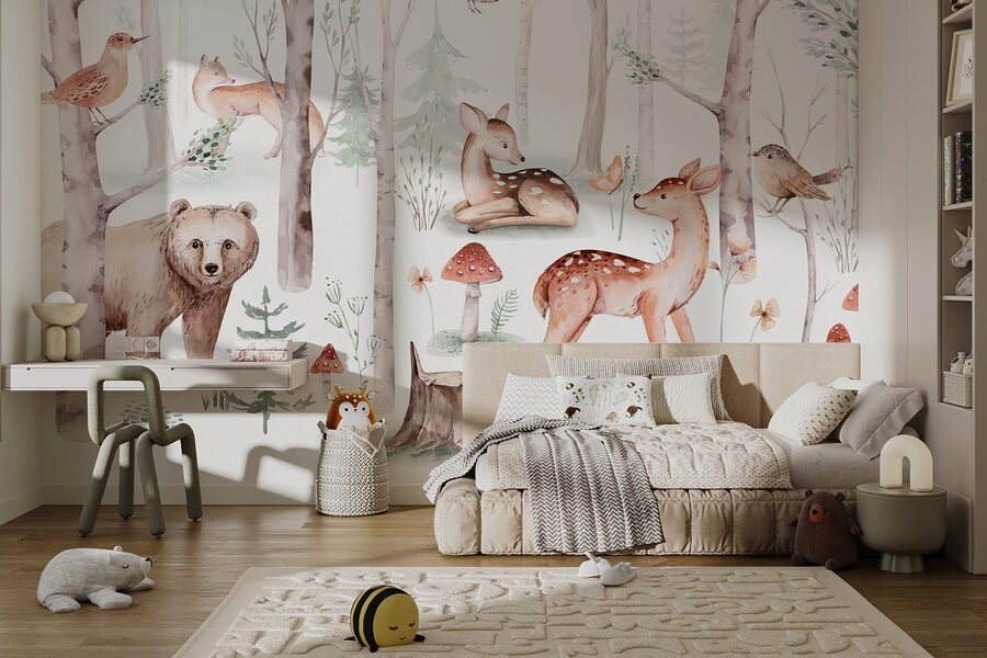 Tauchen Sie mit dieser bezaubernden Fototapete in ein skurriles Waldgebiet ein. Stellen Sie sich vor, Sie hätten eine gemütliche Waldecke in Ihren eigenen vier Wänden – mit freundlichen Rehen, neugierigen Füchsen und leise singenden Vögeln. Es ist wie eine sanfte Märchenbuchszene an Ihrer Wand! Perfekt für Naturliebhaber oder für alle, die sich einfach mal zurückziehen wollen. Stellen Sie sich vor, wie Sie mit einem Buch in der Hand an einem Tee nippen, während diese heitere Umgebung Sie zum Entspannen einlädt. Wer hätte gedacht, dass Wandkunst so… friedlich sein kann? Verwandeln Sie Ihr Zimmer in einen beruhigenden Rückzugsort, an dem der Wald immer in voller Blüte steht.
