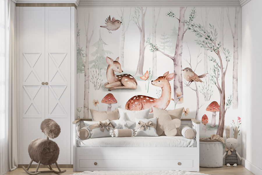 Tauchen Sie mit dieser bezaubernden Fototapete in ein skurriles Waldgebiet ein. Stellen Sie sich vor, Sie hätten eine gemütliche Waldecke in Ihren eigenen vier Wänden – mit freundlichen Rehen, neugierigen Füchsen und leise singenden Vögeln. Es ist wie eine sanfte Märchenbuchszene an Ihrer Wand! Perfekt für Naturliebhaber oder für alle, die sich einfach mal zurückziehen wollen. Stellen Sie sich vor, wie Sie mit einem Buch in der Hand an einem Tee nippen, während diese heitere Umgebung Sie zum Entspannen einlädt. Wer hätte gedacht, dass Wandkunst so… friedlich sein kann? Verwandeln Sie Ihr Zimmer in einen beruhigenden Rückzugsort, an dem der Wald immer in voller Blüte steht.