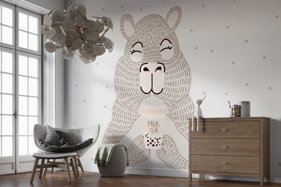 Wer könnte einem Bären mit einer Vorliebe für Bubble Tea widerstehen? Dieses Cartoon-Wandbild bringt einen Hauch von Laune und Wärme in jeden Raum. Stellen Sie sich vor: Sie kommen nach einem langen Tag herein und ein charmanter Bär begrüßt Sie, der mit einem gelassenen Lächeln einen Bubble Tea schlürft. Es ist unmöglich, sich nicht sofort entspannt zu fühlen. Perfekt für eine verspielte Note in Schlafzimmern oder schrulligen Cafés. Ob Sie nun ein Bubble Tea-Fanatiker sind oder einfach nur einen guten Bärenkumpel lieben, dieses Wandbild verleiht Ihrem Raum eine einzigartige, gemütliche Atmosphäre. Wer hätte gedacht, dass ein Bär ein so cooler Mitbewohner sein kann?