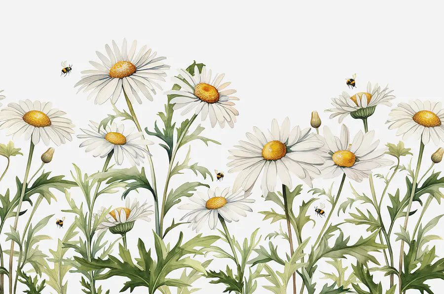 Verschönern Sie jeden Raum mit dem bezaubernden Wandbild “Daisies Dance with Buzzing Bees”. Stellen Sie sich vor, Sie betreten einen Garten, in dem sich Gänseblümchen spielerisch wiegen, während fröhliche Bienen umherschwirren und ihrer Arbeit nachgehen. Diese Fototapete füllt nicht nur eine Wand – sie bringt ein Stück Natur ins Haus. Stellen Sie es sich in einer gemütlichen Küche oder einer entspannenden Leseecke vor, wo es sofort die Stimmung hebt und Freude auslöst. Es ist, als hätte man eine sanfte Brise und einen Hauch von Wildblumenduft direkt zu Hause. Die sanften Farben und das detailreiche Design geben jedem das Gefühl, der Natur ein wenig näher zu sein, selbst an den regnerischsten Tagen. Perfekt für alle, die wollen, dass ihre Dekoration eine Geschichte erzählt, ohne ein Wort zu sagen. Wer würde sich nicht ein wenig summendes Glück in seinem Leben wünschen?