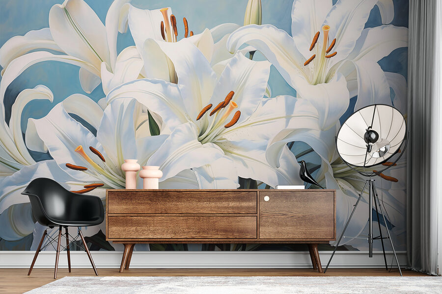 Verwandeln Sie Ihren Raum mit dieser atemberaubenden Fototapete, die elegante weiße Lilien in voller Blüte zeigt. Es ist, als hätten Sie einen Garten direkt an der Wand, der einen Hauch von Natur ins Haus bringt. Stellen Sie sich vor, Sie wachen jeden Morgen mit diesen schönen Blüten auf, als ob sie Ihnen “Guten Tag” zuflüstern würden! Es ist perfekt, um eine gemütliche Ecke zu erhellen oder in einem größeren Raum einen Akzent zu setzen. Die sanften Farben verbreiten eine beruhigende Stimmung und laden zu ruhigen Momenten ein. Freunde werden innehalten und Sie bewundern und vielleicht fragen, wo Sie so ein einzigartiges Stück gefunden haben. Es ist eine mühelose Art, Schönheit zu schaffen, ohne dass man einen grünen Daumen braucht!