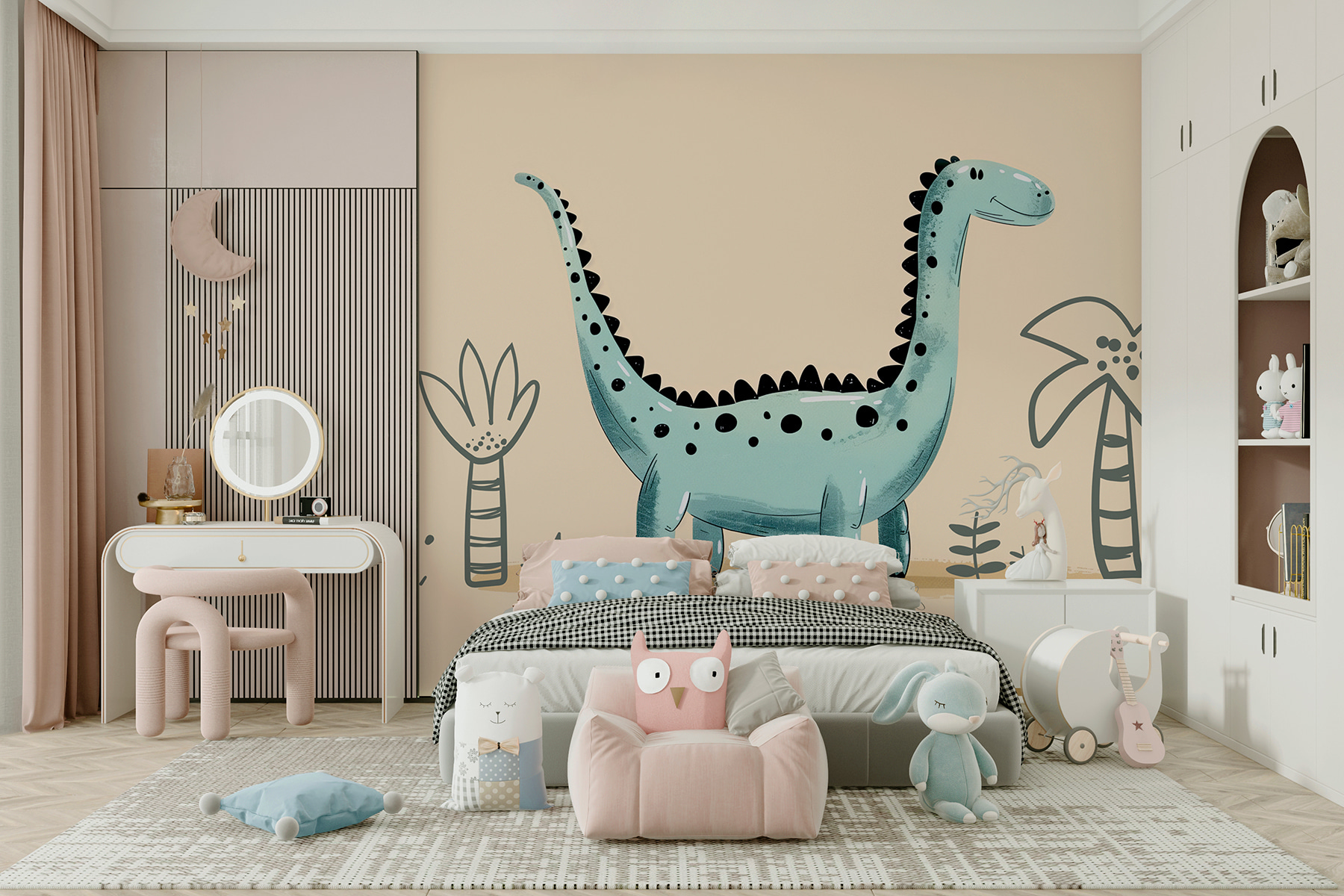 Stellen Sie sich vor, Sie wachen jeden Morgen mit diesem fröhlichen Wesen auf… als würden Sie Ihren Tag mit einer fröhlichen Umarmung beginnen! Und die kleinen Pflanzen und Palmen? Sie verstärken nur die prähistorische Dschungelatmosphäre – niedlich, nicht wahr? Diese Art von Wandbild kann eine langweilige Wand in eine entzückende Märchenszene verwandeln.