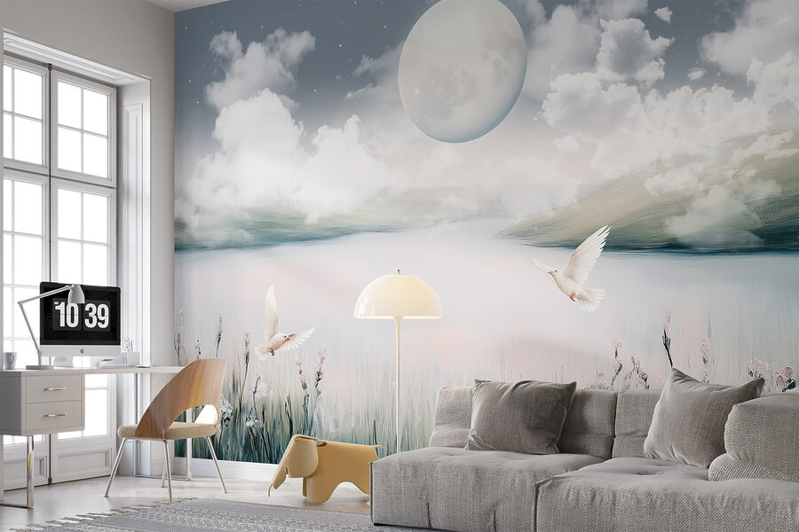 Stellen Sie sich vor, Sie entspannen sich auf Ihrer Couch, eine Tasse Tee in der Hand, und haben das Gefühl, in dieser heiteren Landschaft zu schweben. Die Morgenstunden sind friedlich, die Abende absolut magisch. Perfekt für alle, die die Natur lieben und sich einen Hauch von Skurrilität wünschen. Bonus? Die pastellfarbenen Blumen und Vögel verleihen dem Bild genau den richtigen Charme, ohne zu übertrieben zu wirken. Ein echter Gesprächsanlass beim nächsten Familienessen! 🌙✨