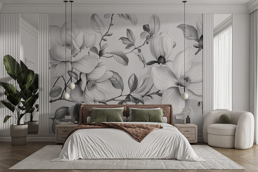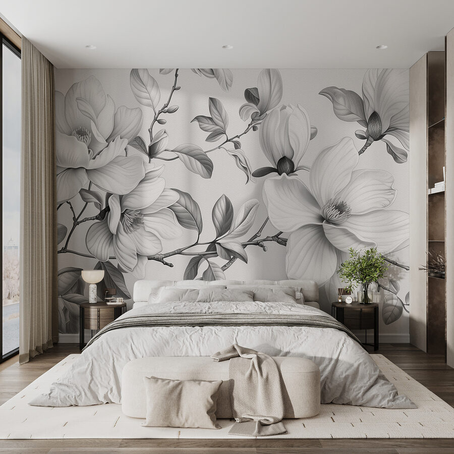 Verwandeln Sie eine triste Wand in ein Kunstwerk mit diesem eleganten monochromen Wandbild mit Blumen. Stellen Sie sich vor, Sie betreten einen ruhigen Garten, in dem jedes einzelne Blütenblatt Eleganz und Charme versprüht. Das verschlungene Design sorgt für eine beruhigende Atmosphäre und eignet sich perfekt für jeden Raum, der einen sanften Hauch von Natur braucht. Stellen Sie sich vor, wie sich Freunde versammeln, um diese atemberaubende Kulisse zu bewundern und vielleicht sogar vor Aufregung ein Getränk verschütten – hoppla! Aber keine Sorge, es geht ja nur um das Erlebnis, nicht wahr? Diese Fototapete fängt die Essenz der Ruhe ein und fügt sich mühelos in jeden Einrichtungsstil ein. Holen Sie sich einen Hauch von frischer Luft nach Hause!