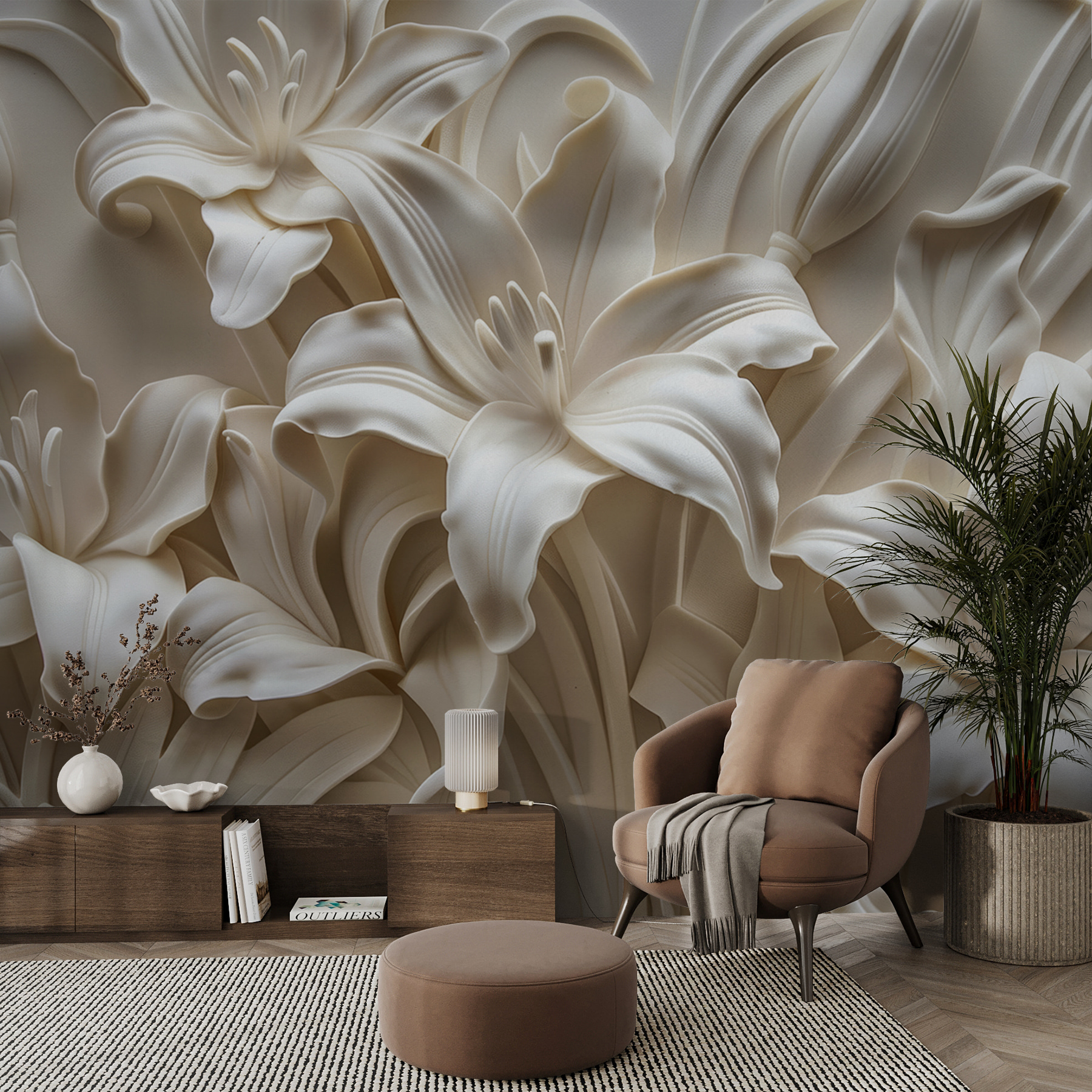 Stellen Sie sich vor, Sie betreten einen Raum und werden von einem Schwall eleganter, cremefarbener Lilien begrüßt, die aussehen, als würden sie sanft aus der Wand auftauchen – ein echter Wow-Faktor! “Fototapeten w01433” sorgt mit seinem floralen 3D-Design für einen Hauch von schicker Raffinesse. Dieses Wandbild ist nicht einfach nur ein weiterer Wanddruck; es verleiht jedem Raum Struktur, Tiefe und eine heitere Atmosphäre. Perfekt für alle, die von flachen, langweiligen Wänden genug haben und sich nach dem gewissen Etwas sehnen.