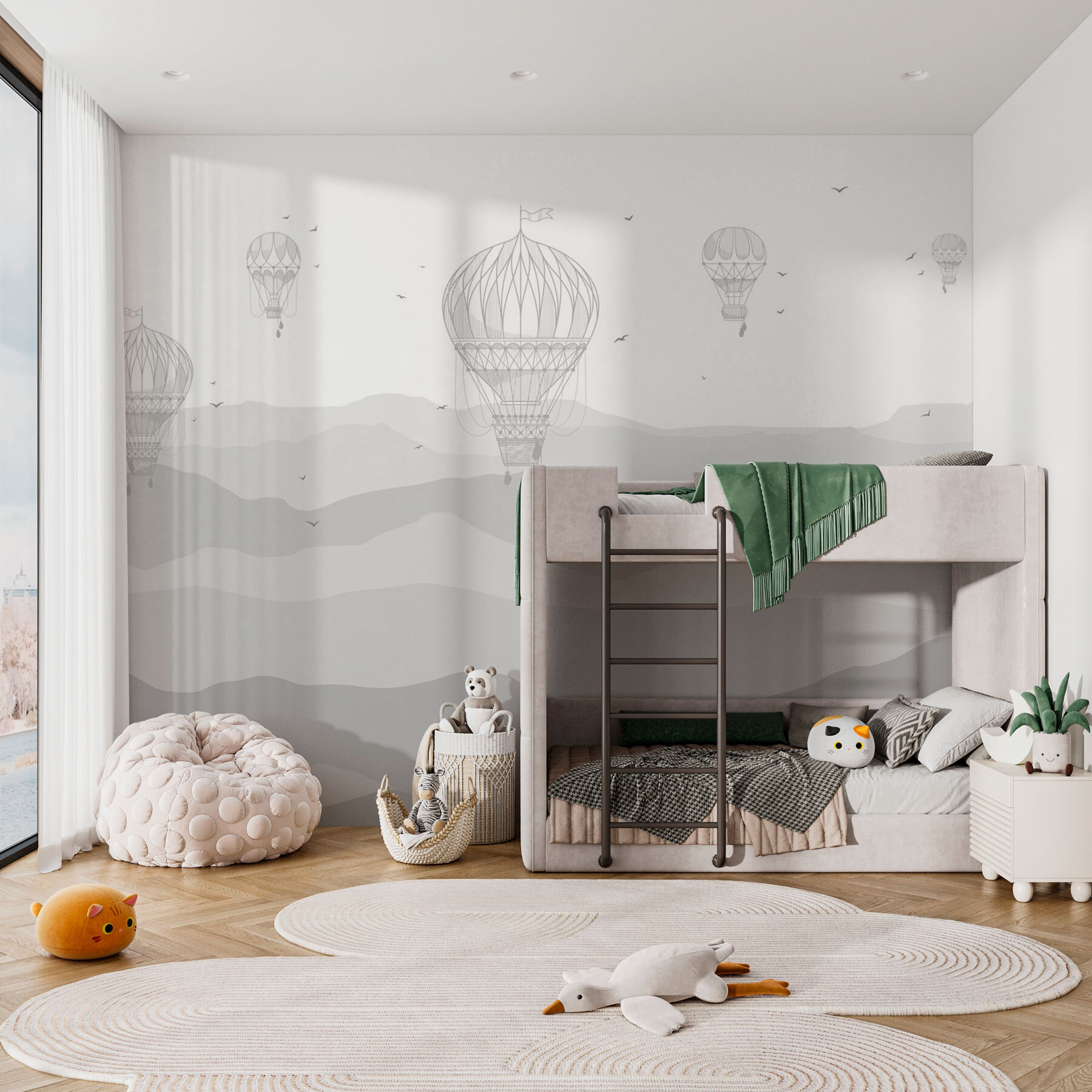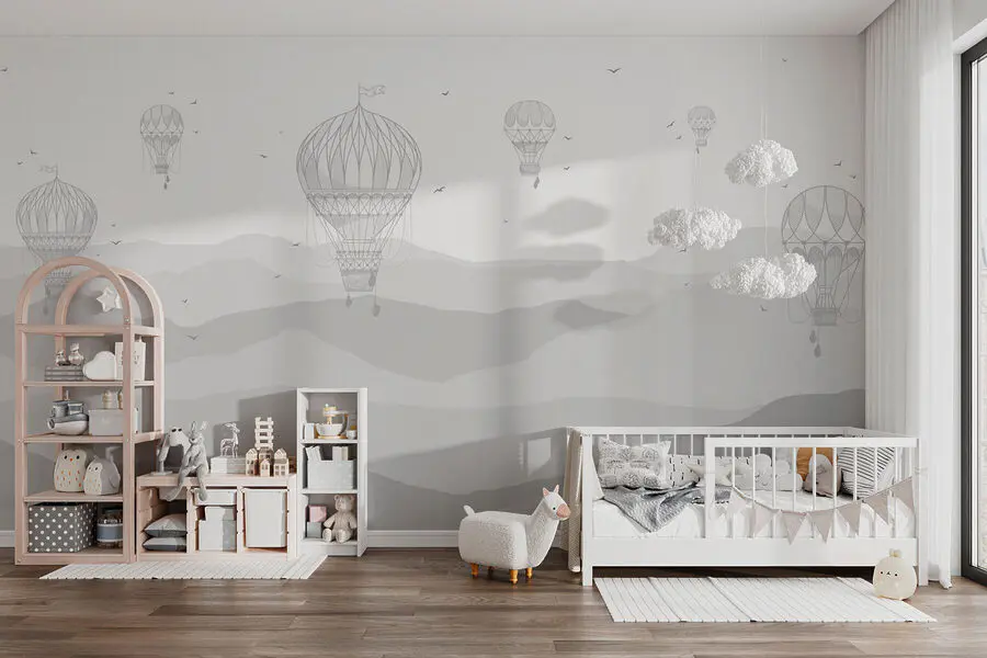 Die sanften Berge in Graustufen und die luftigen Ballons erinnern fast an eine leichte Brise – können Sie sie nicht einfach spüren? Vielleicht schlürfen Sie gerade Ihren Morgenkaffee oder entspannen sich nach einem langen Tag, während Sie auf dieses Wandbild blicken… und plötzlich sind Sie 10.000 Fuß hoch und schweben zwischen den Wolken. Es ist nicht nur eine Wanddekoration, sondern ein ganzes Ambiente – sanft, verträumt und ein wenig magisch… genau das, was Sie in Ihrem Raum noch nicht vermisst haben!