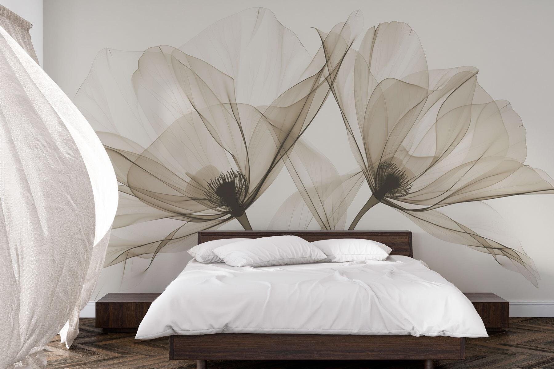Verwandeln Sie eine schlichte Wand in eine ruhige Oase mit dieser atemberaubenden Fototapete, die elegante sepiafarbene Blüten zeigt. Stellen Sie sich vor, Sie betreten einen gemütlichen Raum, der Komfort und Raffinesse ausstrahlt. Die weichen, fließenden Linien der Blumen scheinen zu tanzen und laden dazu ein, an Frühlingstage und warmes Sonnenlicht zu denken, das durch die Blätter fällt. Es ist, als ob man sich ein Stück Natur ins Haus holt, ohne die Gießkanne zu benutzen. Ob im Wohnzimmer, im Schlafzimmer oder sogar in einer ruhigen Leseecke, diese zarten Blüten schaffen eine heitere Stimmung, in der man es sich mit einem guten Buch gemütlich machen kann – oder einfach nur die Schönheit genießen.