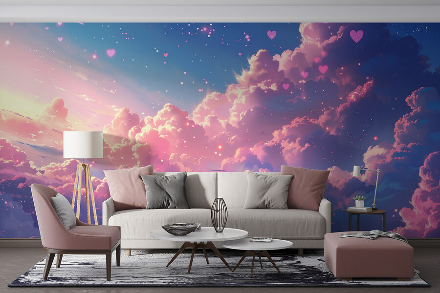Stellen Sie sich vor, Sie blicken nach oben und sehen einen Himmel voller verträumter, rosafarbener Wolken, die aussehen, als wären sie direkt aus einem Märchen entsprungen – diese Fototapete “Fototapeten w01487” ist diese magische Szene für Ihre Wand eingefangen. Es ist, als würde man sich ein Stück Zuckerwatte in die eigenen vier Wände holen. Perfekt für alle, die einen Hauch von Laune und einen Hauch von Gelassenheit am Tag lieben. Die sanften Blau- und Rosatöne verschmelzen miteinander und verleihen jedem Raum eine gemütliche und zugleich erfrischende Atmosphäre. Kinder werden von den herzförmigen Elementen begeistert sein, und bei der nächsten Zusammenkunft könnte es für Gesprächsstoff sorgen. Es ist nicht nur ein Wandbild, sondern ein kleines Stück Glück an Ihrer Wand.