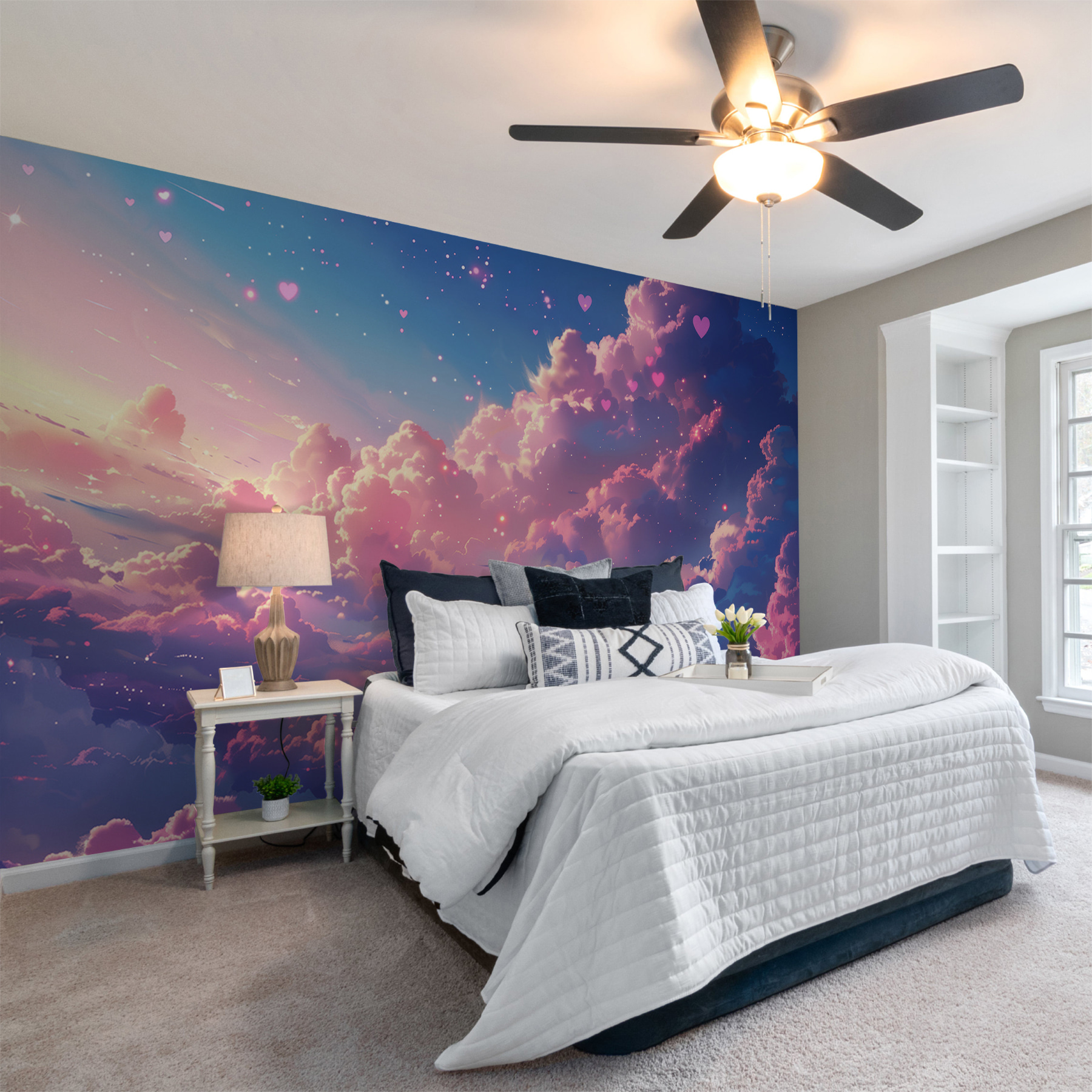 Stellen Sie sich vor, Sie blicken nach oben und sehen einen Himmel voller verträumter, rosafarbener Wolken, die aussehen, als wären sie direkt aus einem Märchen entsprungen – diese Fototapete “Fototapeten w01487” ist diese magische Szene für Ihre Wand eingefangen. Es ist, als würde man sich ein Stück Zuckerwatte in die eigenen vier Wände holen. Perfekt für alle, die einen Hauch von Laune und einen Hauch von Gelassenheit am Tag lieben. Die sanften Blau- und Rosatöne verschmelzen miteinander und verleihen jedem Raum eine gemütliche und zugleich erfrischende Atmosphäre. Kinder werden von den herzförmigen Elementen begeistert sein, und bei der nächsten Zusammenkunft könnte es für Gesprächsstoff sorgen. Es ist nicht nur ein Wandbild, sondern ein kleines Stück Glück an Ihrer Wand.