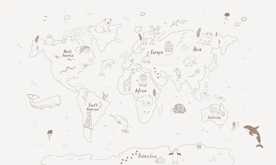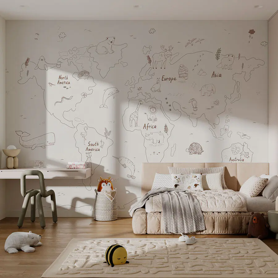 Stellen Sie sich vor, Sie hätten die Welt – buchstäblich! – an Ihrer Wand. “Fototapeten w01502” ist mehr als nur Kunst; es ist ein Fenster zum Abenteuer. Dieses atemberaubende Kunstwerk ist eine Kombination aus niedlichen Tieren und einer handgezeichneten Weltkarte und eignet sich perfekt für jeden Raum, der ein bisschen Laune und Fernweh braucht. Stellen Sie sich vor: Ein Blick und Sie erkunden die Arktis mit einem Eisbären oder wandern durch Asien an der Seite eines niedlichen Elefanten. Es eignet sich hervorragend für Kinderzimmer, Klassenzimmer oder jeden Raum, der einen verspielten Touch gebrauchen kann. Außerdem ist es ein einfacher Gesprächsanlass – Gäste werden gerne auf ihr Lieblingstier zeigen und über ihre Traumziele plaudern. Verwandeln Sie Ihre Wand in eine lustige, lehrreiche Reise!