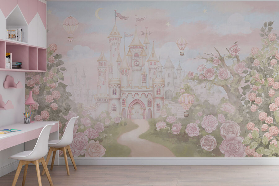 Stellen Sie sich vor, Sie betreten einen Raum und werden in ein verträumtes Schloss entführt, umgeben von üppigen Rosen und skurrilen Heißluftballons, die vorbeischweben. Dieses Wandbild ist nicht nur Dekoration, sondern auch eine Geschichte. Perfekt für alle, die einen Hauch von Magie in ihren Räumen lieben, denn jedes Mal, wenn Sie den Raum betreten, ist es, als würden Sie ein Märchenbuch aufschlagen. Spüren Sie die sanfte Brise, wenn Luftballons durch den pastellfarbenen Himmel schweben, und lassen Sie sich von der zarten Blüte der Blumen in einen Zauberwald entführen. Es ist die Art von Szenerie, die einen Regentag gemütlich macht und die Fantasie und süße Tagträume anregt.