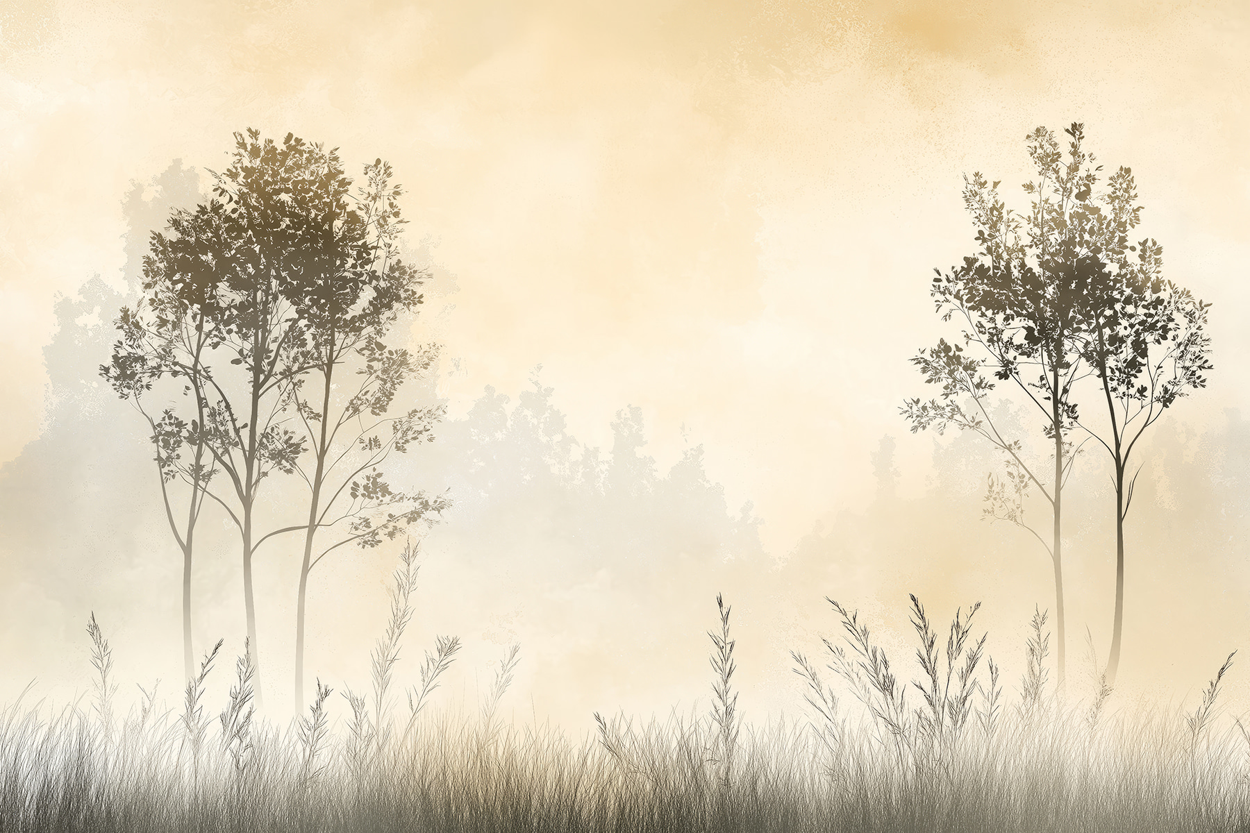 Fototapeten Neblige Landschaft mit Bäumen und Gras (Artikelnummer: w01547)