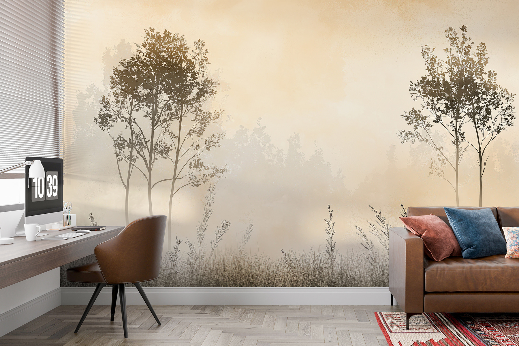 Stellen Sie sich vor, Sie wachen mit dieser verträumten Fototapete “Neblige Landschaft mit Bäumen und Gras” auf. Es ist, als würde man direkt von seinem Wohnzimmer aus in einen ruhigen Wald eintauchen. Kennen Sie diese beruhigende Stimmung an einem ruhigen Morgen? Dieses Bild fängt sie perfekt ein. Der weiche Nebel umhüllt anmutige Bäume, durch die ein Hauch von Gras hindurchschaut. Perfekt, um eine schlichte Wand in Ihren eigenen friedlichen Rückzugsort zu verwandeln.
