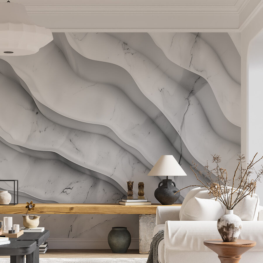 Stellen Sie sich vor, Sie betreten einen Raum und werden von der beruhigenden Wirkung einer weißen Marmoroberfläche mit gewellten Linien begrüßt. Das ist wie ein Wellness-Tag für Ihre Wände! Diese Fototapete hat diese schicke, raffinierte Ausstrahlung, aber mit einem gewissen Pfiff – die Wellenlinien verleihen genau die richtige Menge an spielerischer Energie. Perfekt für eine gemütliche Sitzecke oder ein elegantes Büro. Stellen Sie sich vor, Sie schlürfen einen Kaffee, fühlen sich schick und doch überraschend entspannt. Das ist Ihr Raum, der mit einem kleinen Marmorzauber aufgewertet wurde und gewöhnliche Tage in außergewöhnliche Tage verwandelt. Wer hätte gedacht, dass eine Wand so viel bewirken kann?