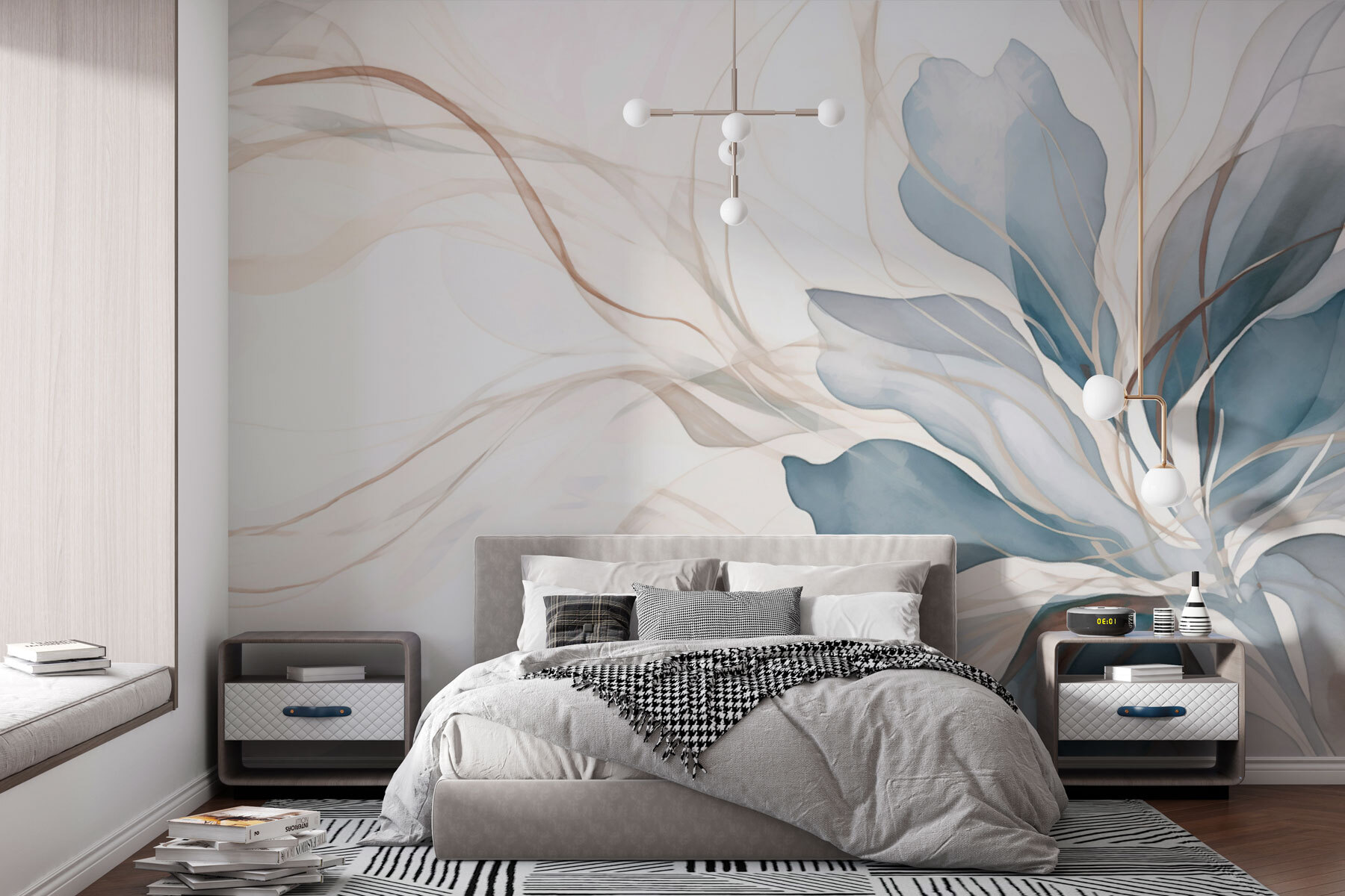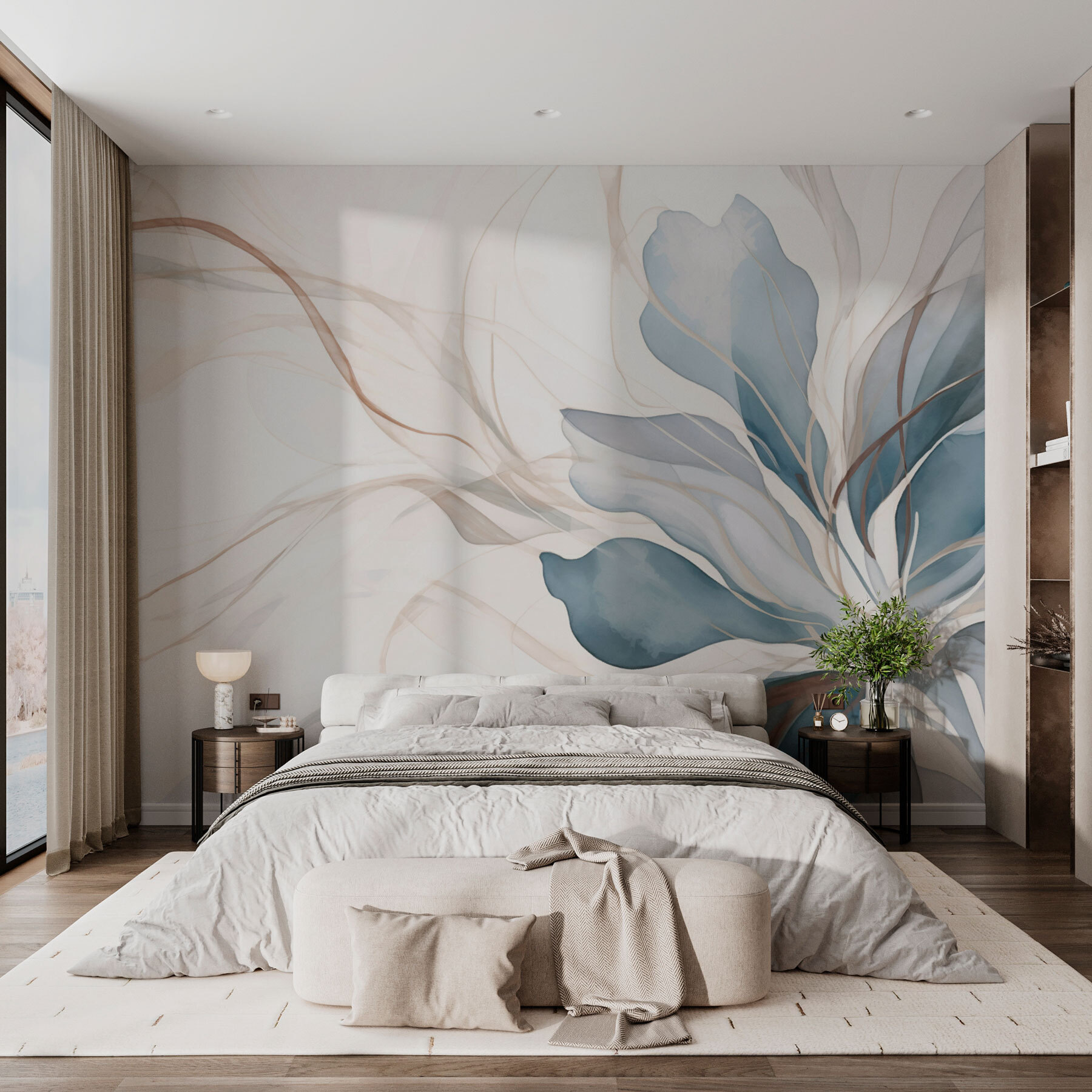 Verwandeln Sie jede Wand in einen ruhigen Zufluchtsort mit dieser ätherischen Blumenwandmalerei. Stellen Sie sich vor, Sie wachen mit sanften Blautönen und erdigen Tönen auf, die eine ruhige Atmosphäre schaffen, die sich wie eine sanfte Umarmung anfühlt. Es ist, als ob Sie sich einen ruhigen Garten direkt in Ihren Wohnraum holen. Dieses Wandbild eignet sich perfekt für eine Ecke oder ist kühn genug, um als Blickfang zu dienen, denn es strahlt Freude und Wärme aus. Vielleicht bleiben Ihre Freunde mitten im Satz stehen und lassen sich von dem verträumten Kunstwerk verzaubern. Egal, ob Sie einen Kaffee trinken oder sich mit einem Buch einkuscheln, es bringt einen Hauch von Natur mit, der selbst die trübsten Tage aufhellen kann.