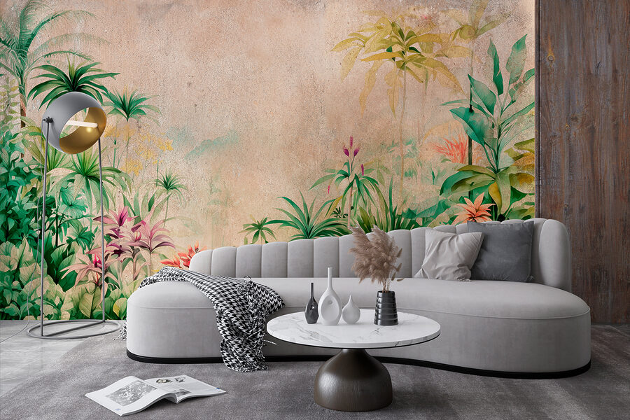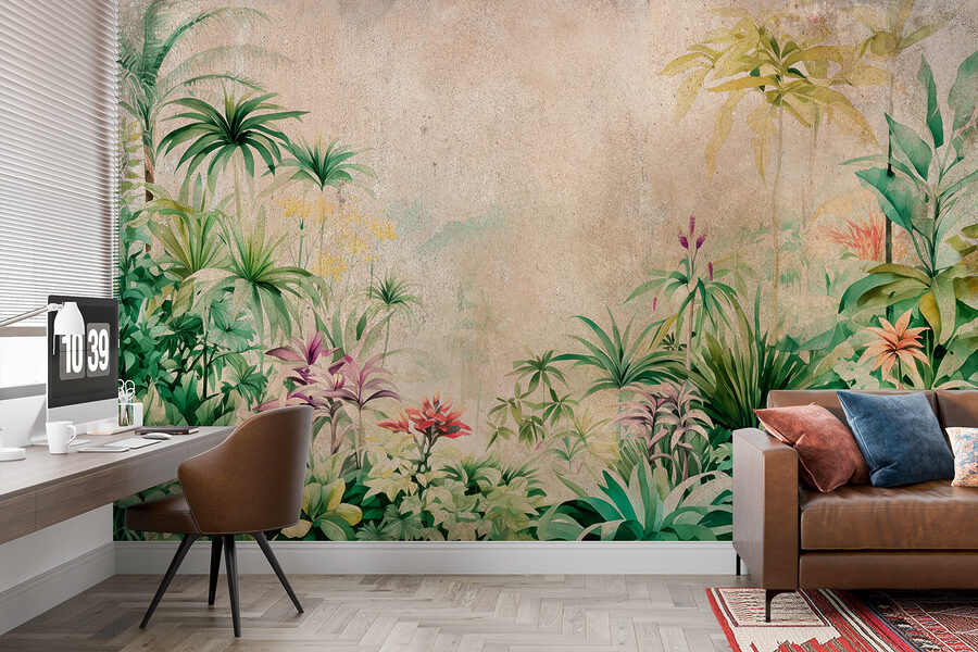 Stellen Sie sich vor: Sie sitzen in Ihrem Wohnzimmer und trinken eine Tasse Tee, und plötzlich befinden Sie sich in einem üppigen Dschungel! Dieses “Wandgemälde mit Pflanzen und Blumen” ist so, als ob Sie ein Portal zu einem ruhigen, grünen Paradies direkt in Ihrem Zuhause öffnen würden. Es ist nicht nur ein Wandbild – es ist ein Erlebnis. Die herrlichen tropischen Farbtöne und das sanfte Wiegen der Palmenblätter lassen Sie vielleicht ein oder zwei Mal tief durchatmen. Perfekt für alle, die von der Natur ohne Ungeziefer träumen. Es ist, als würde Ihre Wand ihr eigenes kleines Regenwald-Refugium eröffnen. Was für eine fantastische Flucht!