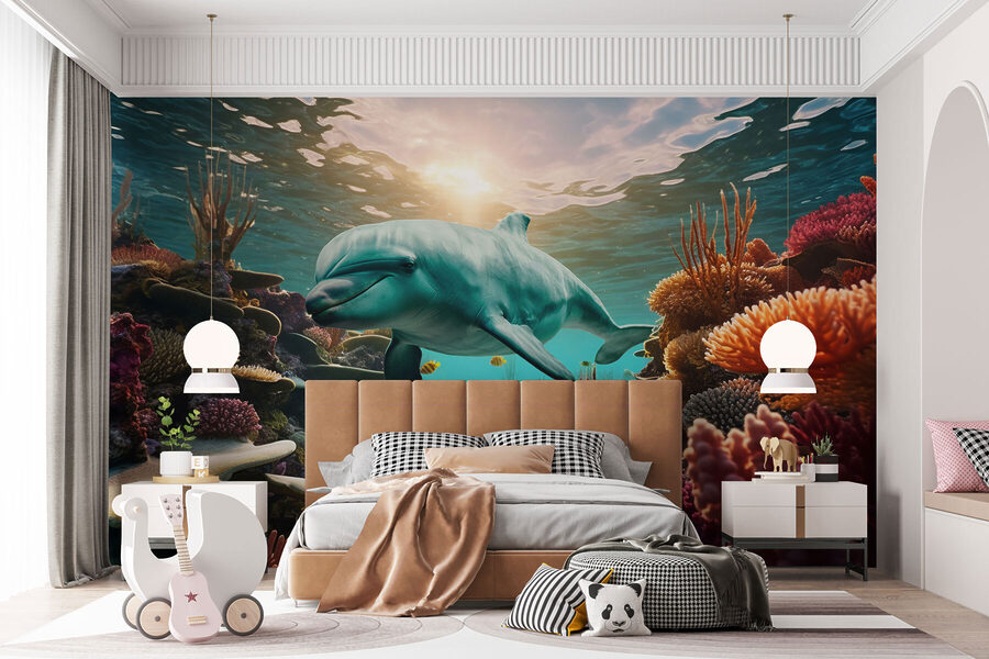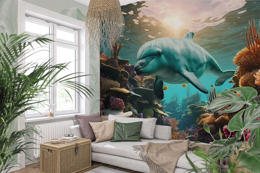 Tauchen Sie ein in einen Hauch von Gelassenheit mit dieser Fototapete, die einen Delfin zeigt, der gelassen in einem lebhaften Ozean schwimmt. Stellen Sie sich das vor – die Wände verwandeln sich in eine verträumte Unterwasserwelt mit bunten Korallen und fröhlichen Fischen. Es ist, als hätten Sie ein Fenster zu einem hellen, friedlichen Ozean direkt in Ihrem Zuhause. Ihre Freunde werden sicherlich stehen bleiben und sich fragen, ob sie in ein Aquarium getreten sind. Stellen Sie sich vor, Sie wachen mit dieser atemberaubenden Szene auf und fühlen sich jeden Tag ein bisschen entspannter. Das ist nicht nur Dekoration, sondern ein tägliches Abenteuer, das auf Sie wartet. Diese Fototapete ist perfekt, um eine luftige Atmosphäre am Meer zu schaffen und bringt Sonnenschein und Freude in jeden Raum!