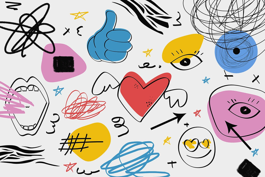 Eine lebendige Fototapete, die fast wie eine Explosion der Kreativität in Ihrem Raum wirkt! Diese Sammlung farbiger Objekte fängt die spielerische Essenz alltäglicher Kritzeleien ein – stellen Sie sich vor, Sie hätten einen Freund, der nicht aufhören kann, lustige Gesichter und Gesten zu machen. Sie bringt eine coole, entspannte Atmosphäre mit sich, die einen langweiligen Raum in einen lebendigen Zufluchtsort verwandeln kann.