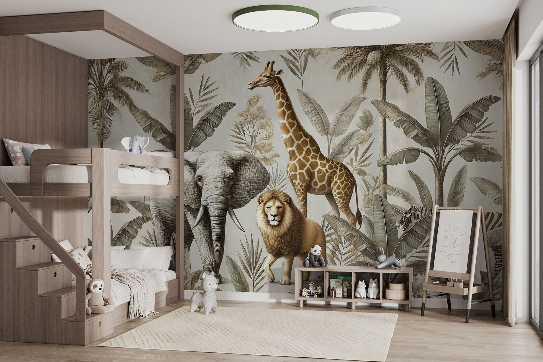 Verwandeln Sie Ihren Raum in einen exotischen Zufluchtsort mit dieser atemberaubenden Fototapete, die eine lebhafte Dschungelszene zeigt. Stellen Sie sich einen kühnen Elefanten, eine königliche Giraffe und einen majestätischen Löwen vor, die sich inmitten üppiger Pflanzen und Palmen tummeln – wie könnte ein Raum nicht abenteuerlicher wirken? Es ist, als würde man sich ein Stück Wildnis ins Haus holen. Familie und Freunde werden gerne über den wilden Tiger plaudern, der im Grünen lauert, während sie an ihrem Kaffee nippen. Außerdem schaffen die warmen, erdigen Töne eine beruhigende Atmosphäre, die perfekt zum Entspannen und Inspirieren ist. Dieses Wandbild ist nicht nur Dekoration, es ist ein kleines Abenteuer, das nur darauf wartet, zu passieren!