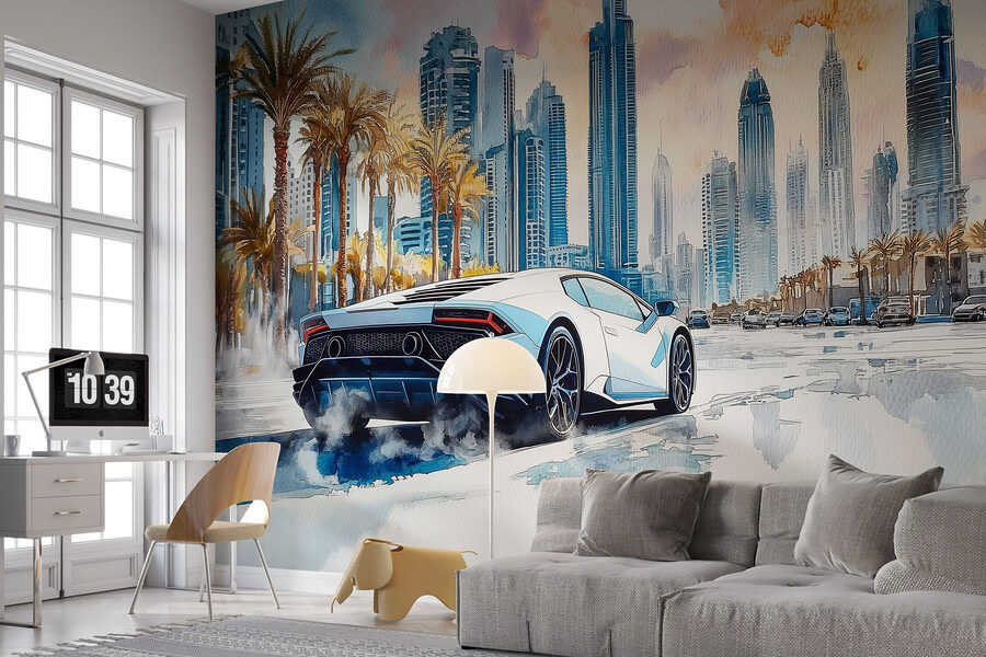 Verwandeln Sie jeden Raum mit dieser lebendigen Fototapete, die einen schnittigen weißen Sportwagen zeigt, der eine von Palmen gesäumte Straße hinunterfährt. Es ist, als ob Sie die Essenz einer Küstenfahrt direkt in Ihr Wohnzimmer bringen würden! Stellen Sie sich vor, Sie schlürfen Ihren Morgenkaffee, während Sie von einem epischen Roadtrip träumen, den Wind in den Haaren und die warme Sonne im Gesicht. Die Mischung aus städtischen Wolkenkratzern und üppigen Palmen vermittelt echte Urlaubsstimmung, so dass es schwer fällt, nicht zu lächeln. Außerdem sind die Farben knallig – perfekt, um Freude oder vielleicht sogar ein bisschen Fernweh zu wecken. Dieses Wandbild ist nicht nur Dekoration, sondern auch eine Erinnerung daran, dass das Abenteuer gleich um die Ecke ist!
