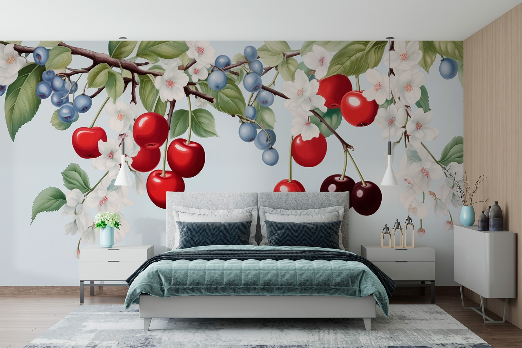 Holen Sie sich ein Stück Natur in Ihren Raum mit dieser atemberaubenden Fototapete, die Kirschen und Blaubeeren auf einem Ast zeigt. Es ist, als würde man einen ganzen Obstgarten ins Haus holen – nur ohne die Bienen und die klebrigen Finger! Die leuchtenden Rottöne und sanften Blautöne heben sich von einem beruhigenden Hintergrund ab und schaffen eine ruhige Atmosphäre, die perfekt für ein Schlafzimmer oder ein Wohnzimmer ist. Stellen Sie sich vor, wie Sie beim Anblick dieser köstlichen Früchte einen Tee trinken und träumen, oder wie Sie sich eine gemütliche Leseecke einrichten, in der Geschichten lebendig werden, genau wie diese Blüten. Diese Fototapete bringt einen sanften Hauch von Natur mit sich und lässt jeden Tag ein bisschen magischer erscheinen. Ihre Wände haben diesen Genuss verdient!