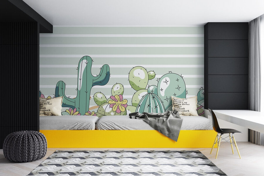 Verwandeln Sie jeden Raum in eine verspielte Oase mit diesem entzückenden Wandbild, das eine lebhafte Gruppe von Kakteen mit fröhlichen Blumen zeigt. Stellen Sie sich vor, Sie betreten einen Raum, in dem diese schrulligen Pflanzen ein Gefühl von Wärme und Spaß vermitteln, als hätten Sie eine kleine Wüstenparty direkt an Ihrer Wand. Die sanften, beruhigenden Streifen im Hintergrund bilden einen sanften Ausgleich zu den leuchtenden Farben der Kakteen und eignen sich daher perfekt für ein Kinderzimmer oder eine gemütliche Leseecke. Es ist wie ein kleines Geheimnis der Natur, das zum Lächeln einlädt und die Fantasie anregt. Stellen Sie sich vor, wie Kinder sich mit einem Buch unter diesem zauberhaften Wandbild einrollen oder von ihrem nächsten Abenteuer in einem magischen Garten träumen.