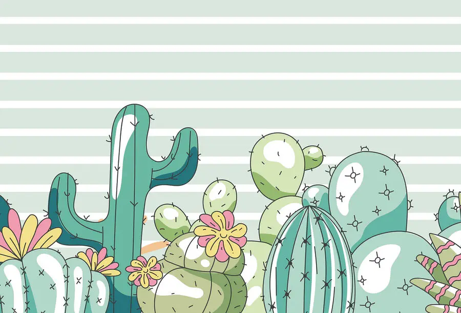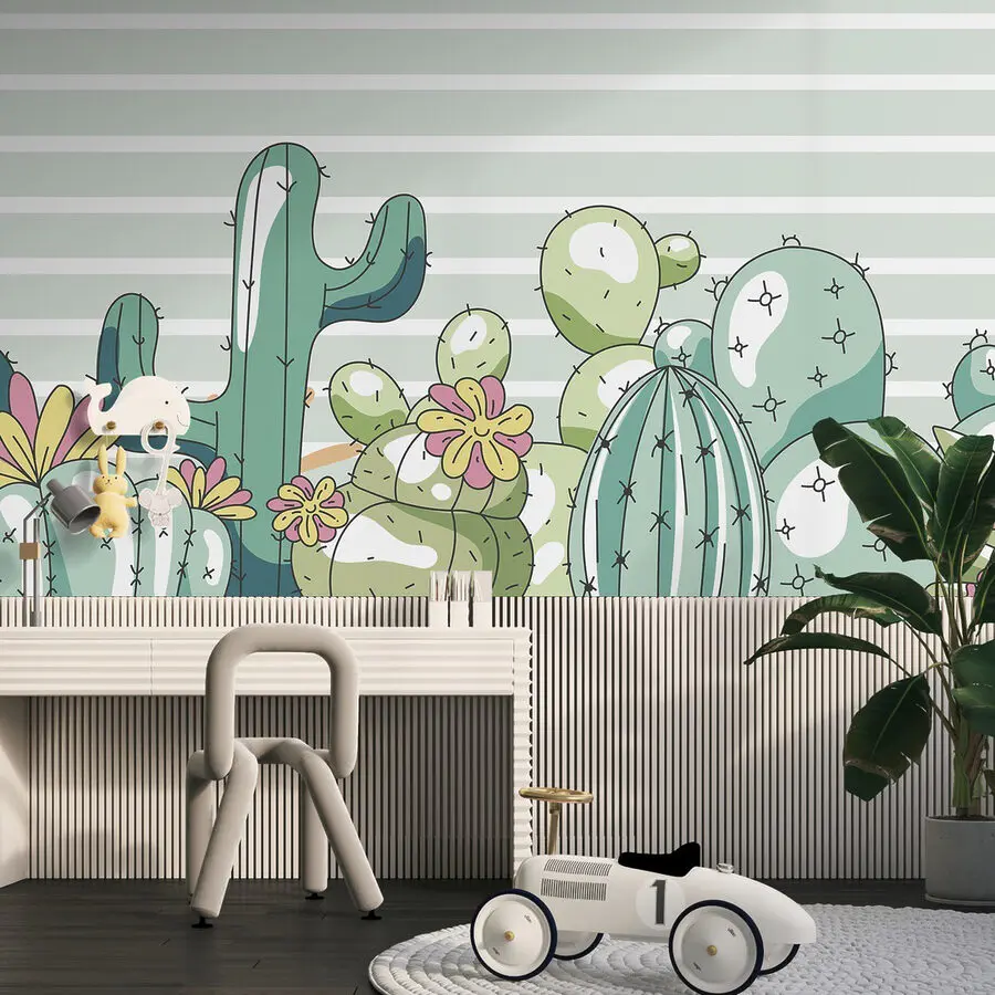 Verwandeln Sie jeden Raum in eine verspielte Oase mit diesem entzückenden Wandbild, das eine lebhafte Gruppe von Kakteen mit fröhlichen Blumen zeigt. Stellen Sie sich vor, Sie betreten einen Raum, in dem diese schrulligen Pflanzen ein Gefühl von Wärme und Spaß vermitteln, als hätten Sie eine kleine Wüstenparty direkt an Ihrer Wand. Die sanften, beruhigenden Streifen im Hintergrund bilden einen sanften Ausgleich zu den leuchtenden Farben der Kakteen und eignen sich daher perfekt für ein Kinderzimmer oder eine gemütliche Leseecke. Es ist wie ein kleines Geheimnis der Natur, das zum Lächeln einlädt und die Fantasie anregt. Stellen Sie sich vor, wie Kinder sich mit einem Buch unter diesem zauberhaften Wandbild einrollen oder von ihrem nächsten Abenteuer in einem magischen Garten träumen.