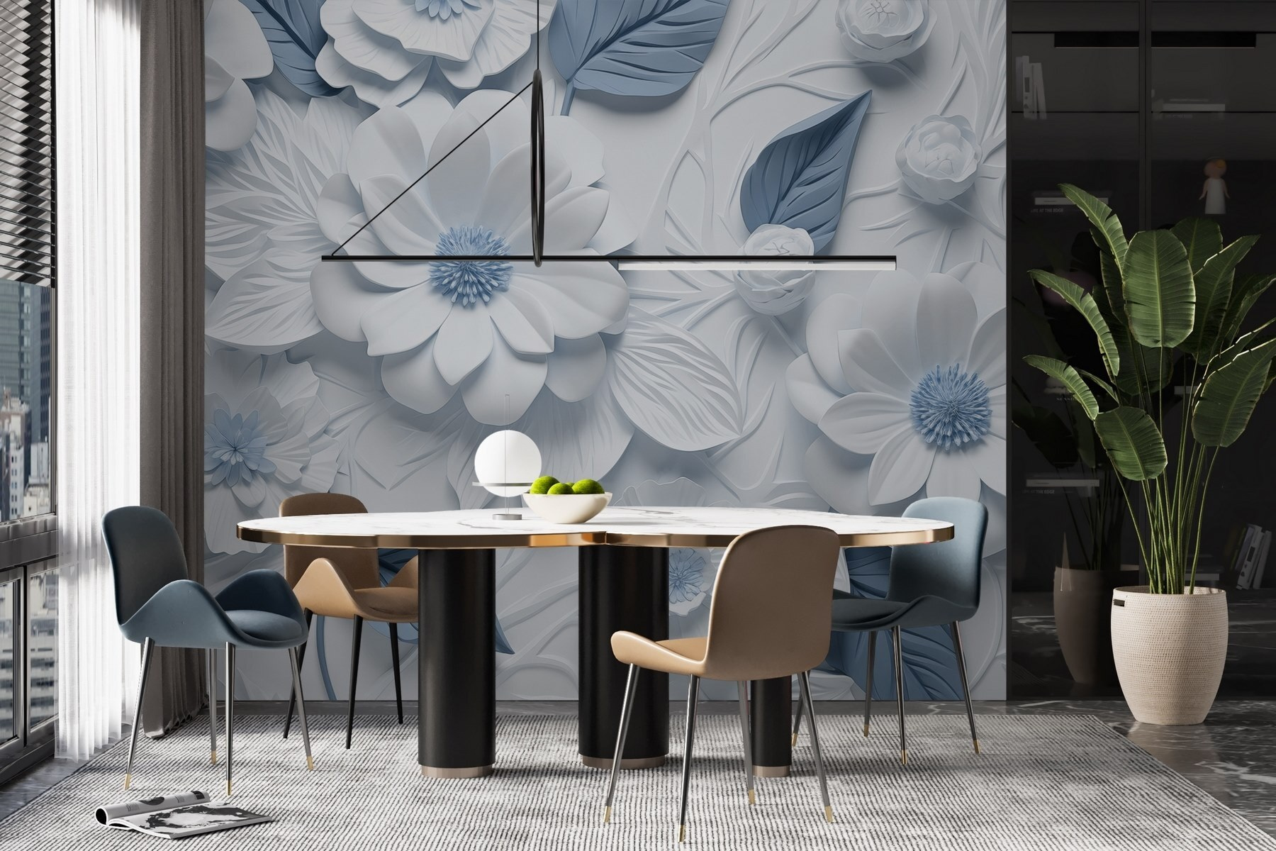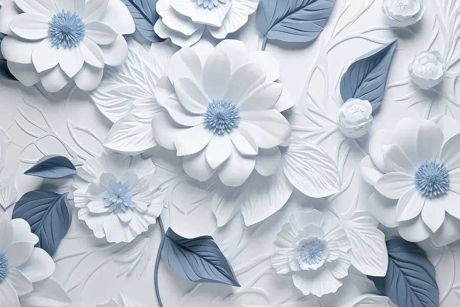Verwandeln Sie jeden Raum in einen ruhigen Zufluchtsort mit dieser charmanten Fototapete mit schönen weißen und blauen Blumen. Es fühlt sich an, als würde man einen friedlichen Garten betreten, ganz bequem von zu Hause aus. Die filigranen Details der Blüten und Blätter schaffen eine erfrischende Atmosphäre, die an sonnige Tage und sanfte Brisen denken lässt. Stellen Sie sich eine gemütliche Leseecke oder ein lebendiges Wohnzimmer vor, das durch diese künstlerische Note aufgewertet wird. Freunde werden mitten im Gespräch innehalten, nur um es zu bewundern. Es ist nicht nur Dekoration, es ist ein Gefühl – beruhigend, aufmunternd und perfekt für Tagträume.