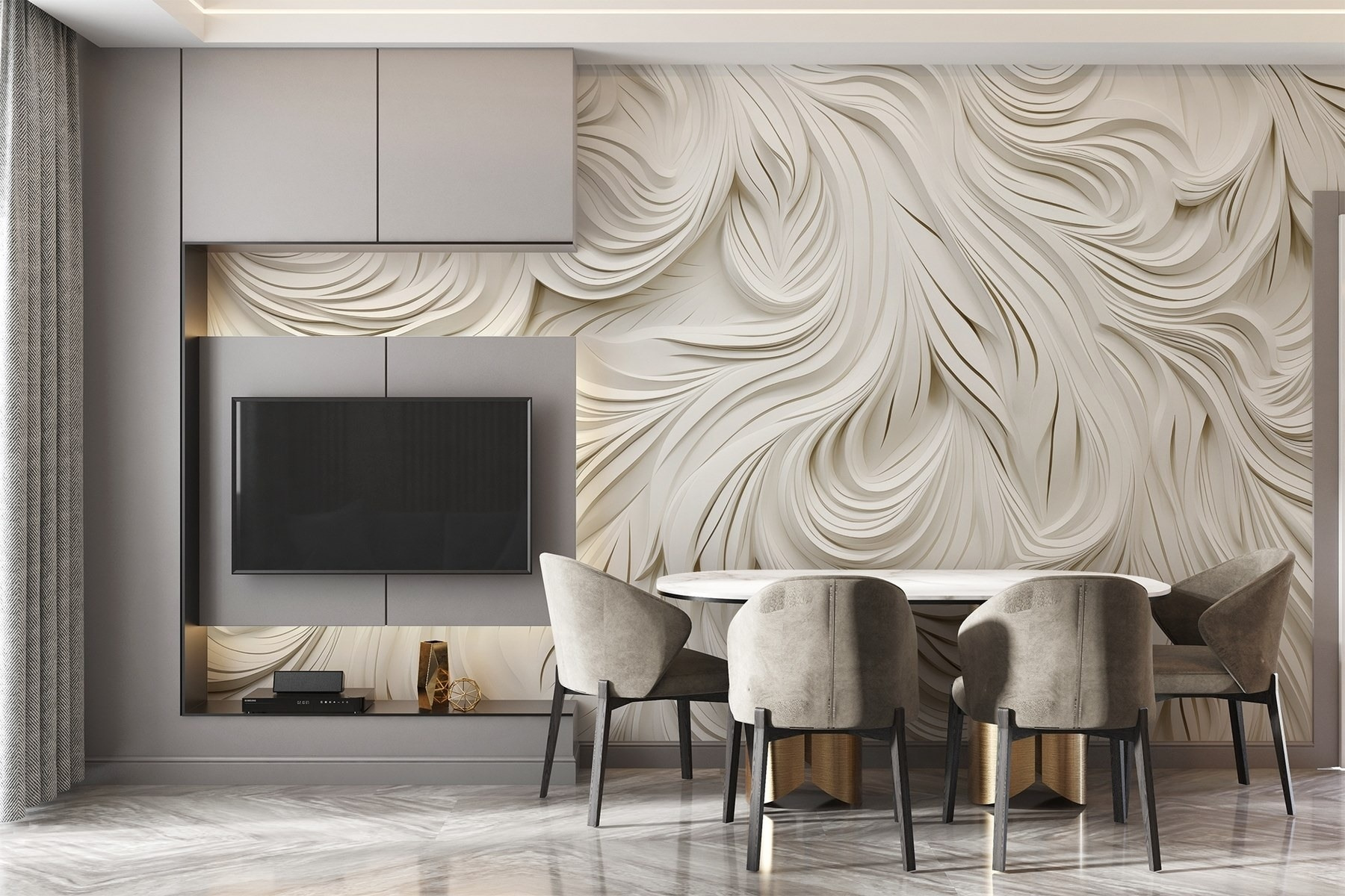 Verwandeln Sie jeden Raum in einen traumhaften Rückzugsort mit dieser fesselnden Fototapete. Mit ihren verschlungenen Wellenlinien, die fast wie sanfte Wellen zu fließen scheinen, bringt sie ein Gefühl von Bewegung und Gelassenheit in Ihren Raum. Stellen Sie sich vor: Sie betreten Ihr Zimmer und werden anstelle der üblichen langweiligen Wände von einem weichen, skulpturalen Design begrüßt, das den Geist sofort beruhigt. Es ist wie eine kuschelige Umarmung für Ihre Wände. Diese Fototapete könnte die Kreativität bei der Arbeit anregen oder einfach die perfekte Kulisse für einen ruhigen Abend zu Hause sein. Perfekt für alle, die sich nach einem Hauch von Einzigartigkeit sehnen!